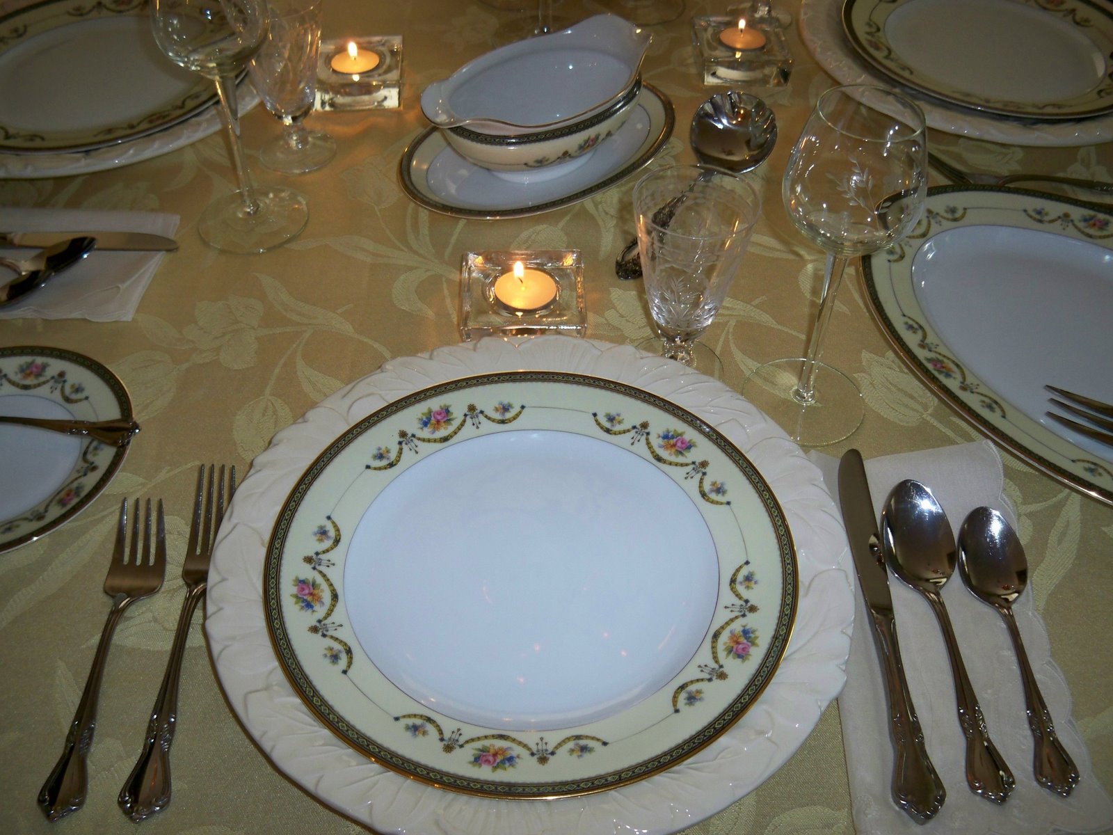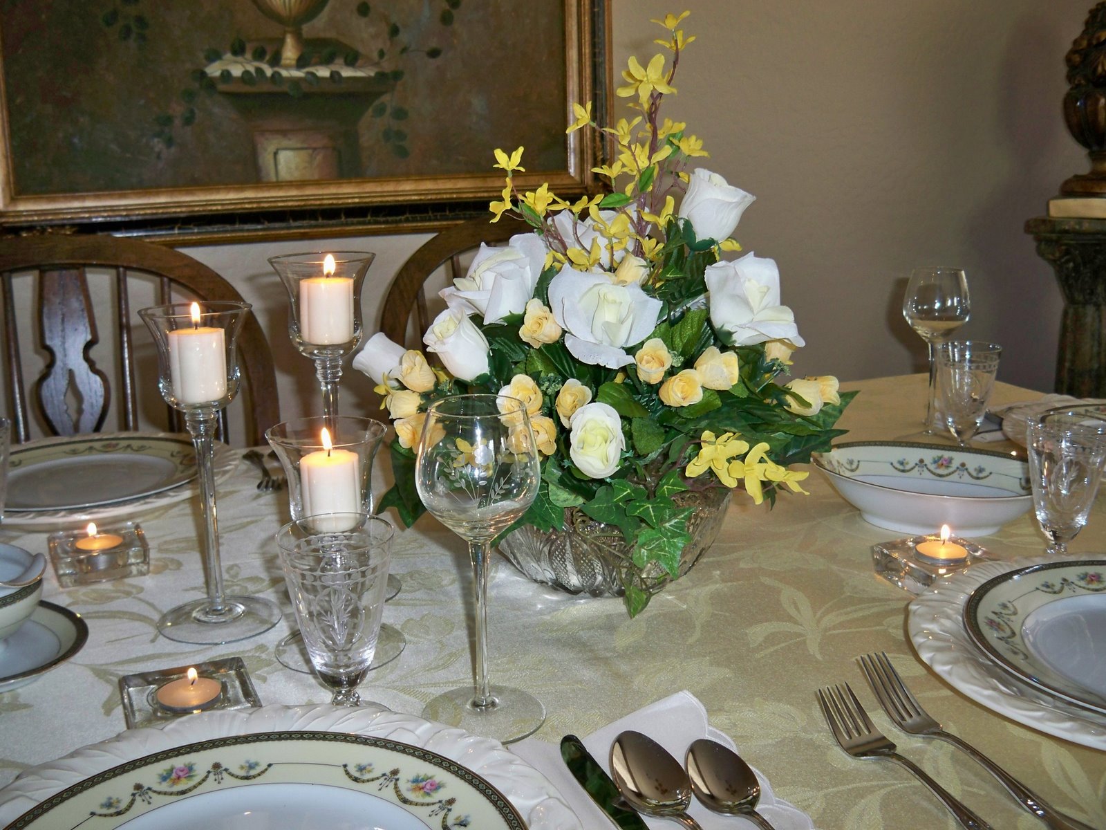 A final view of the table with the candles aglow. The yellow tablecloth really emphasises the soft yellow tones of the china. I purchased this wonderful china for only $39.99 and the Replacements value would be over $250.00. Gotta love it when you find a real bargain. Yippee!!!!Some of you have asked how can I find so many bargains. I live reasonably near Sun City and Sun City Grand. There are very frequent Estate Sales as the elderly living there either pass on or go into a home. If something doesn’t sell it is donated to the local GW near there. It always makes me a little sad to see some precious lady’s things at the GW, however I hope it would please her to know that when I find them I do care for and love them. They all become wonderful treasures to me.Thanks for stopping by. I always look forward to your visits. Please come again soon.