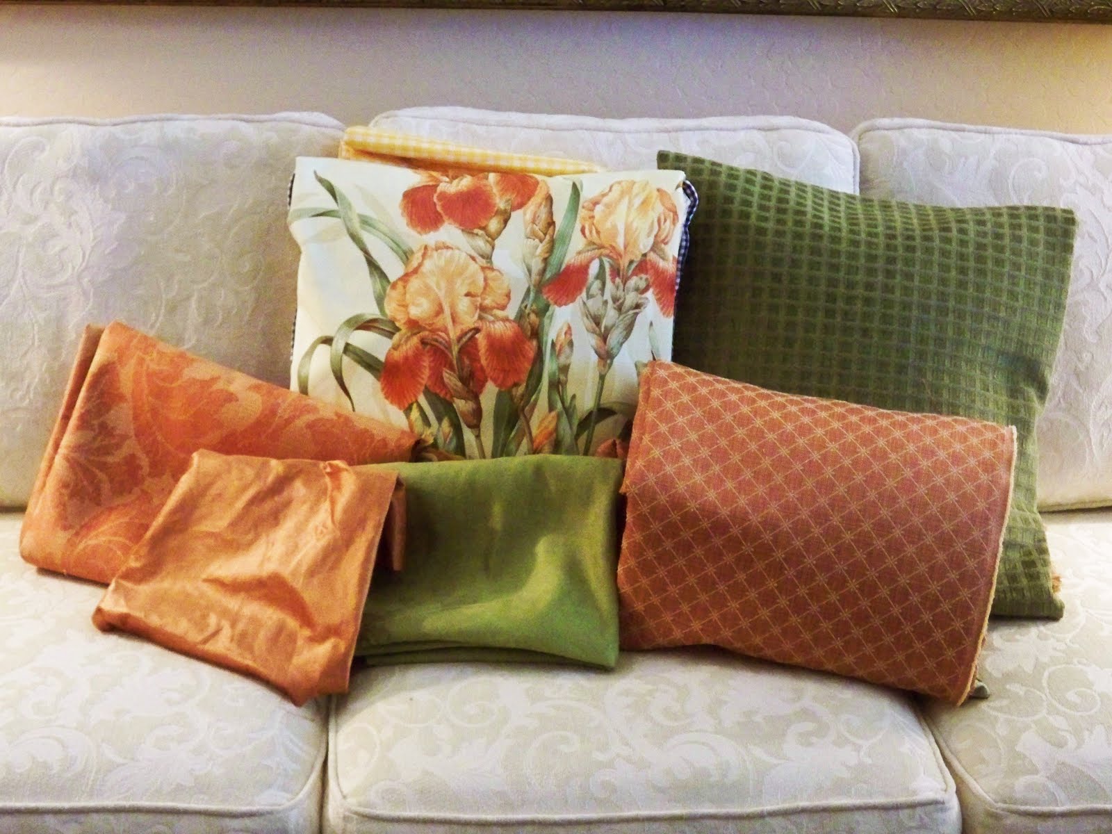 I showed you my fabric that I found for new pillows, now to figure out which ones to make how big, square, round, oblong, with trim or without and which fabric goes where. Ok, those decisions made, now on to the next step.