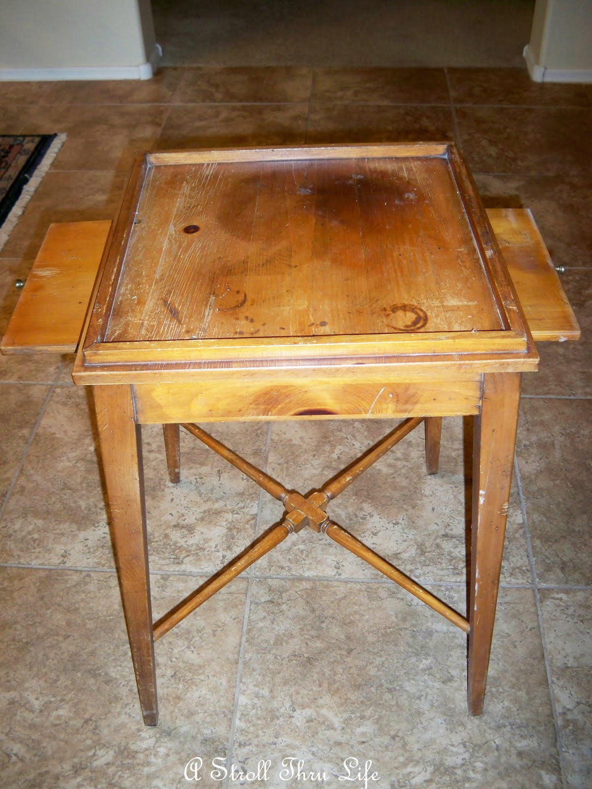 Poor little table, it is so cute with it’s two pull out shelves, but it needs some help desperately.