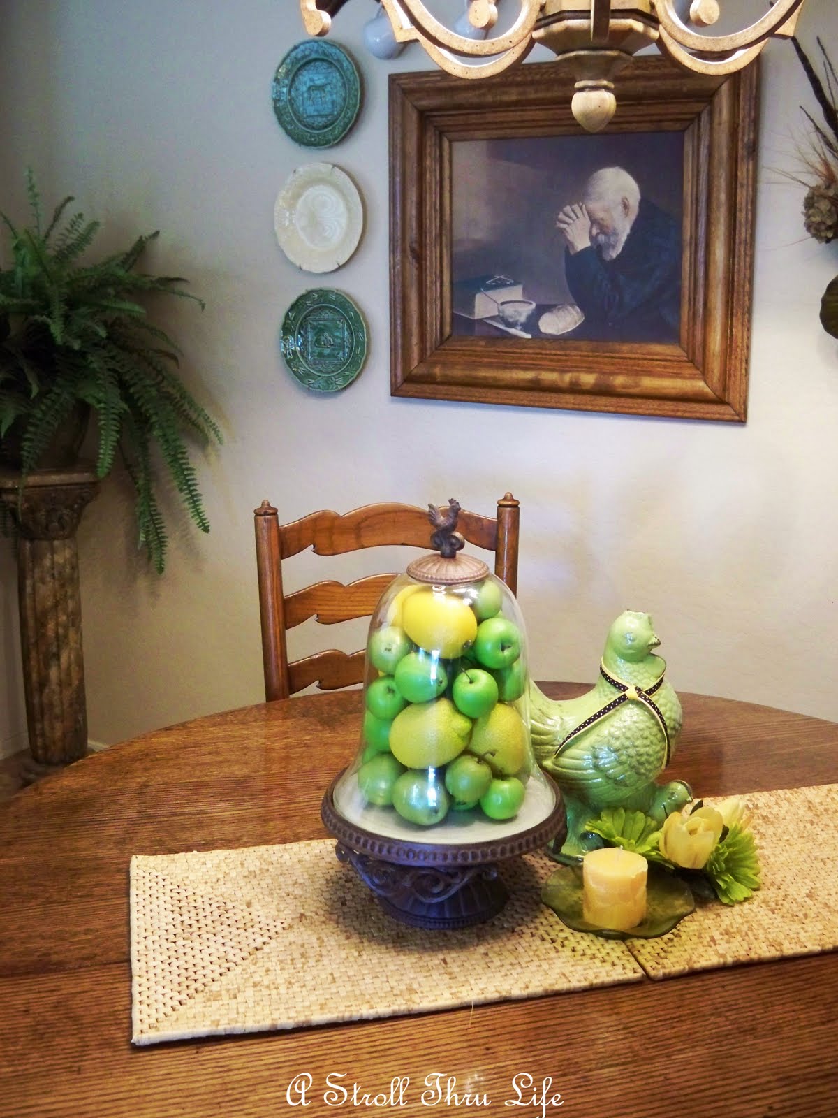 Bright lime green and such a snooty little chick. A few flowers and a candle all placed on two wicker placemats.