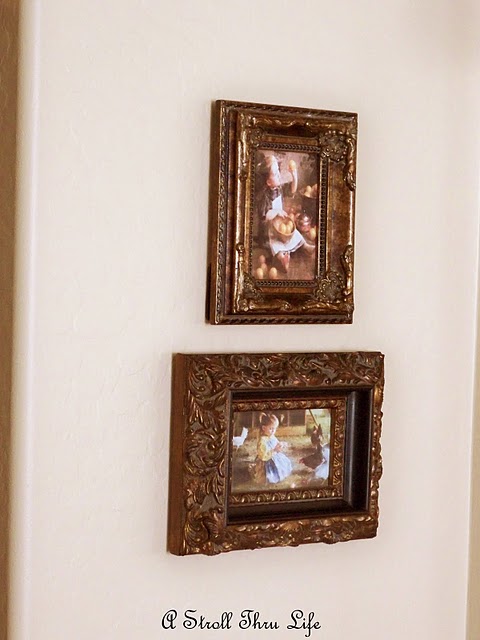 The corner wall in the dining room also has 2 small pictures that I just placed there. The frames and prints tie in well to the gallery wall in the hall, so it all goes together.