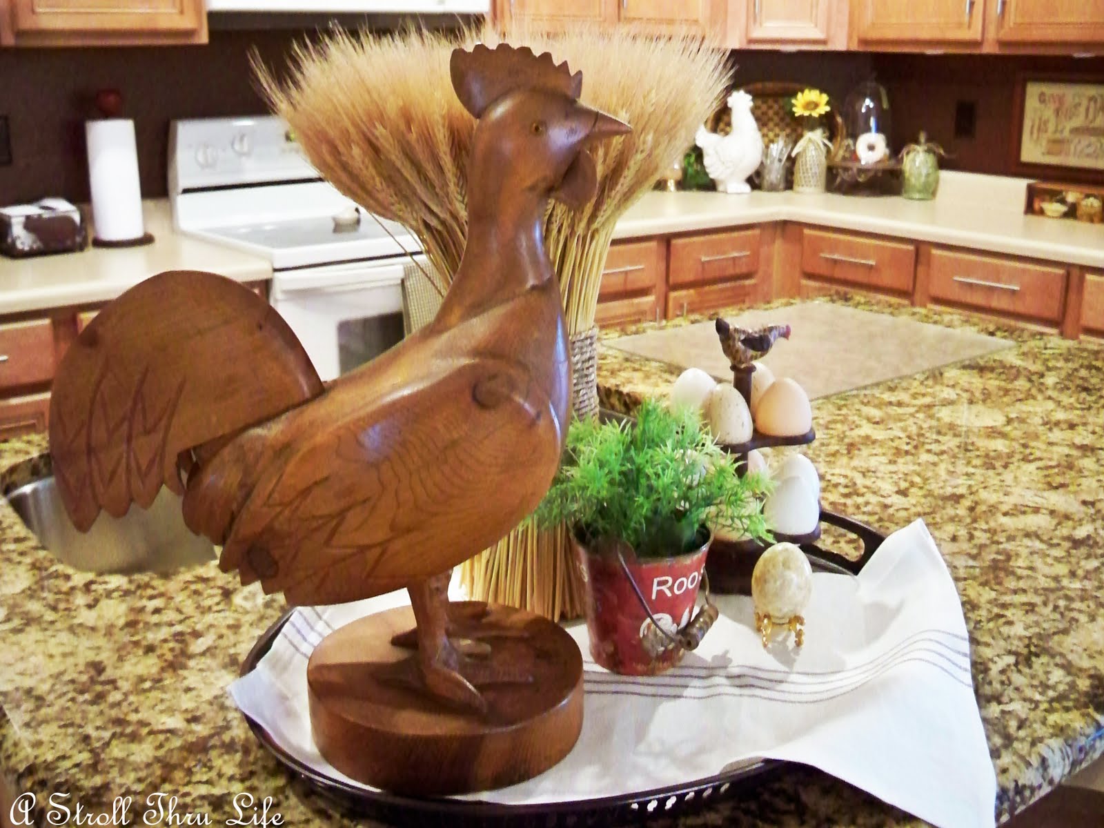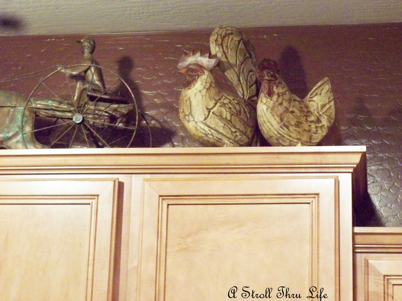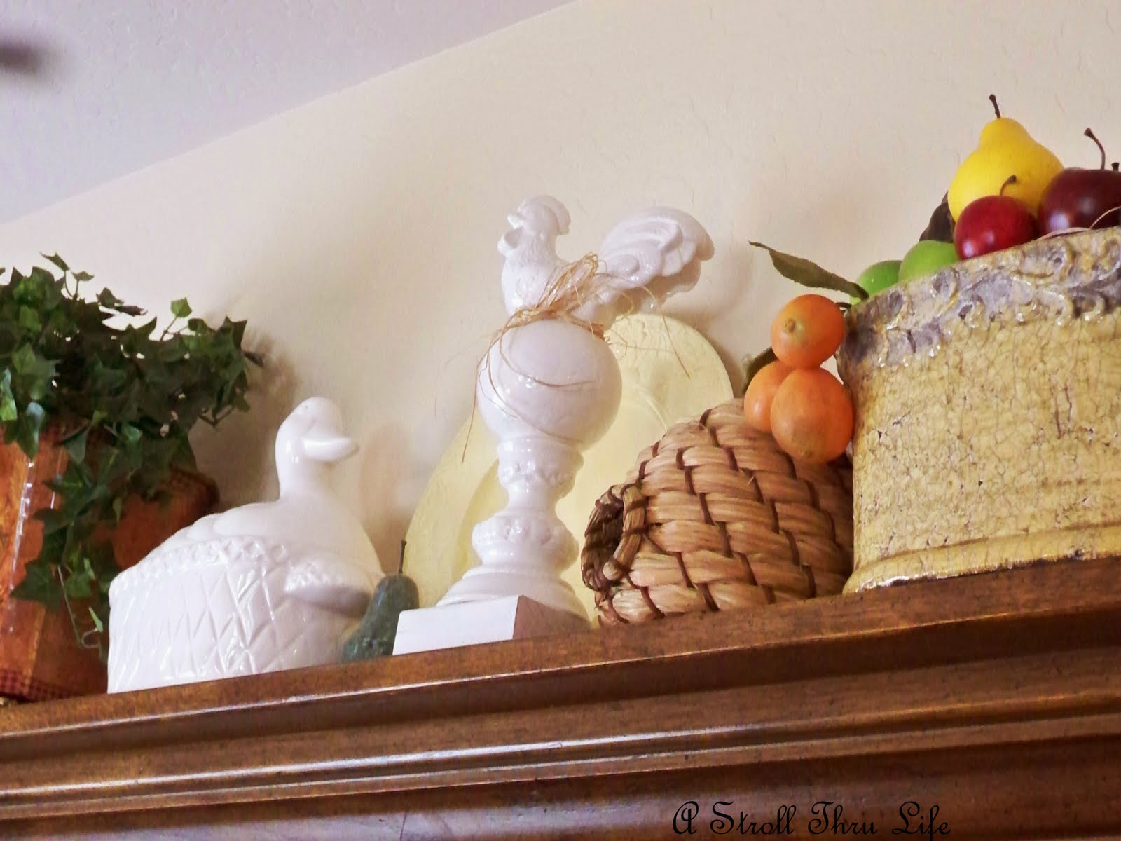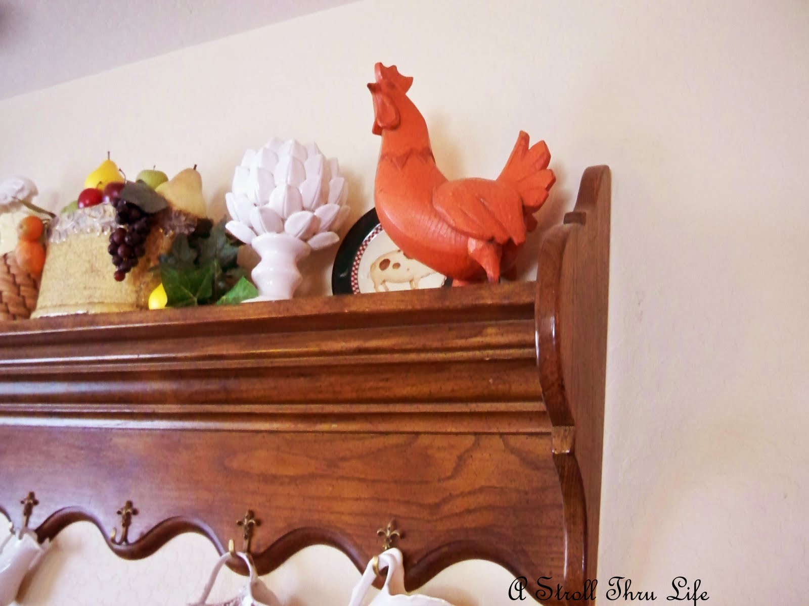 Let’s start off with the top of the fridge. I love me some roosters and chicks in all kinds of colors, so my lime green chick is the center of this vignette.