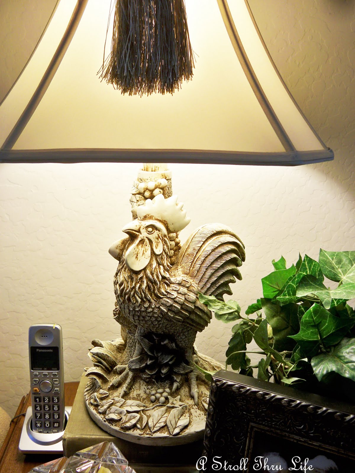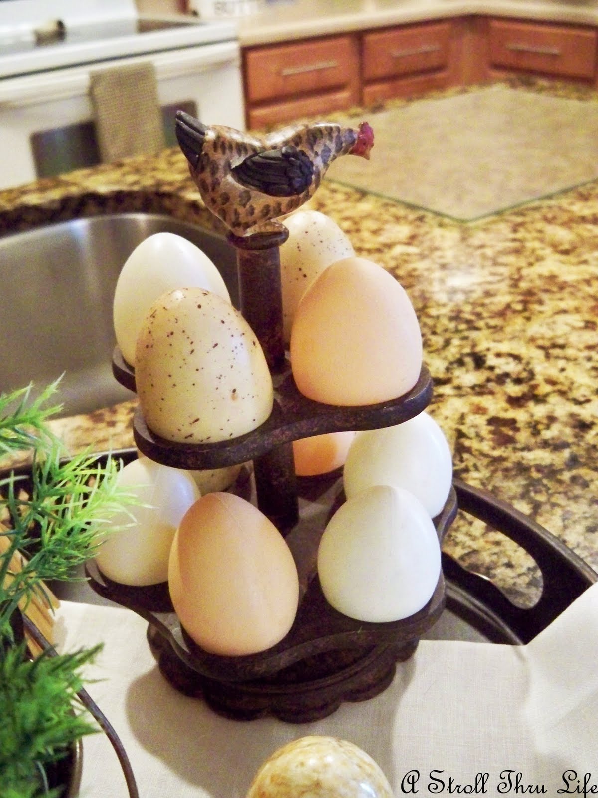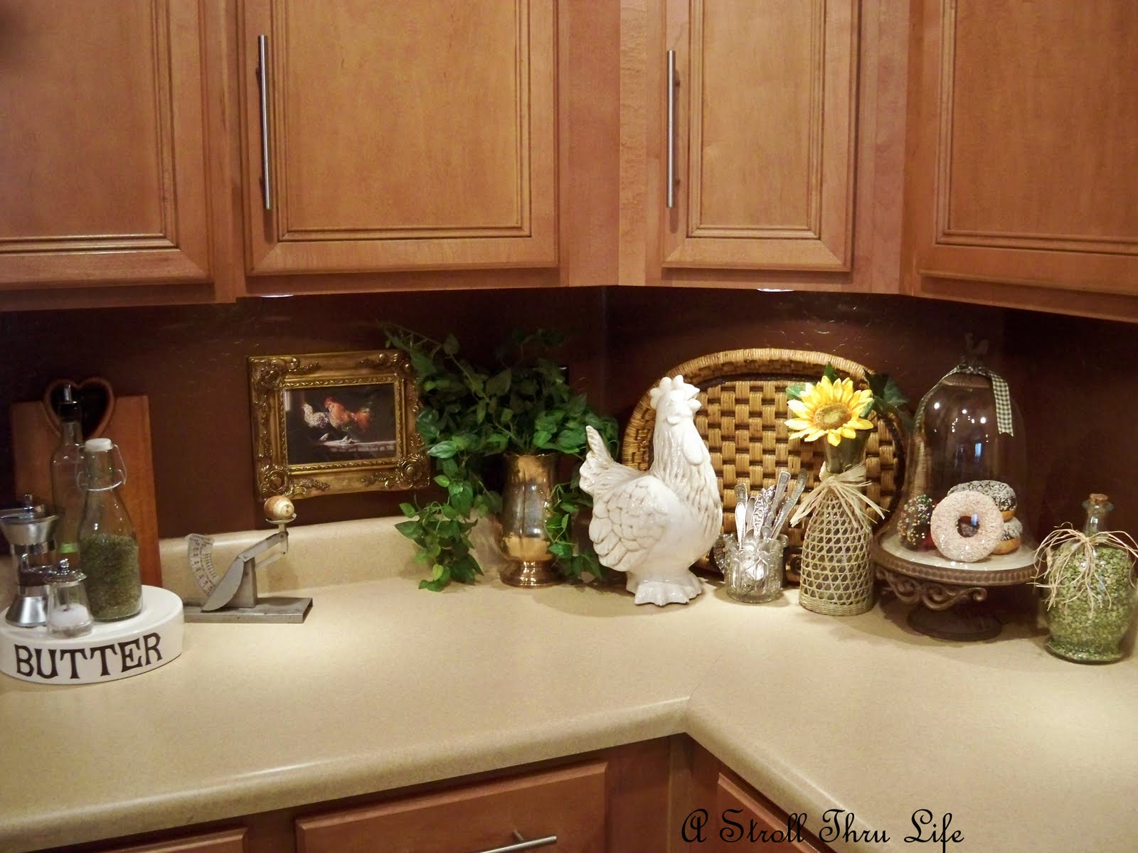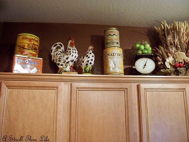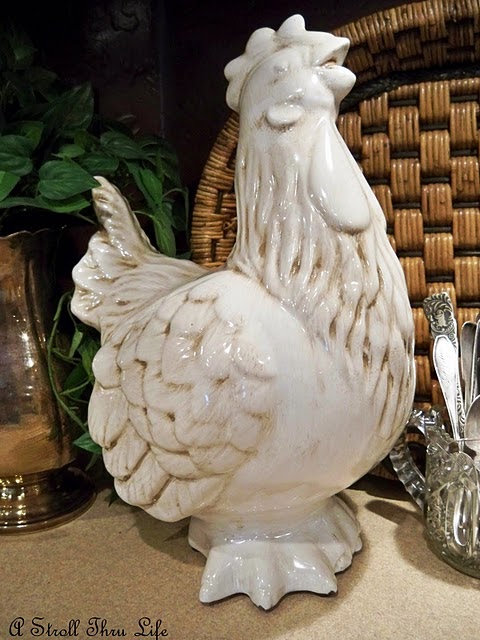 Let’s start off with the top of the fridge. I love me some roosters and chicks in all kinds of colors, so my lime green chick is the center of this vignette.