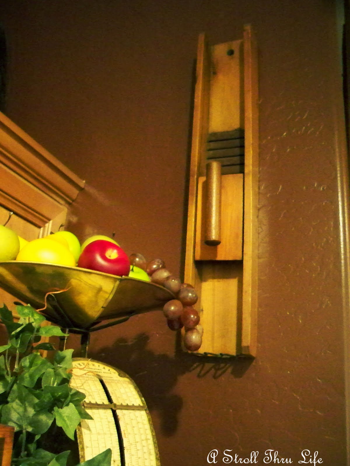 The antique shredder hangs on the wall next to the fridge and it ties in well with the vignette.