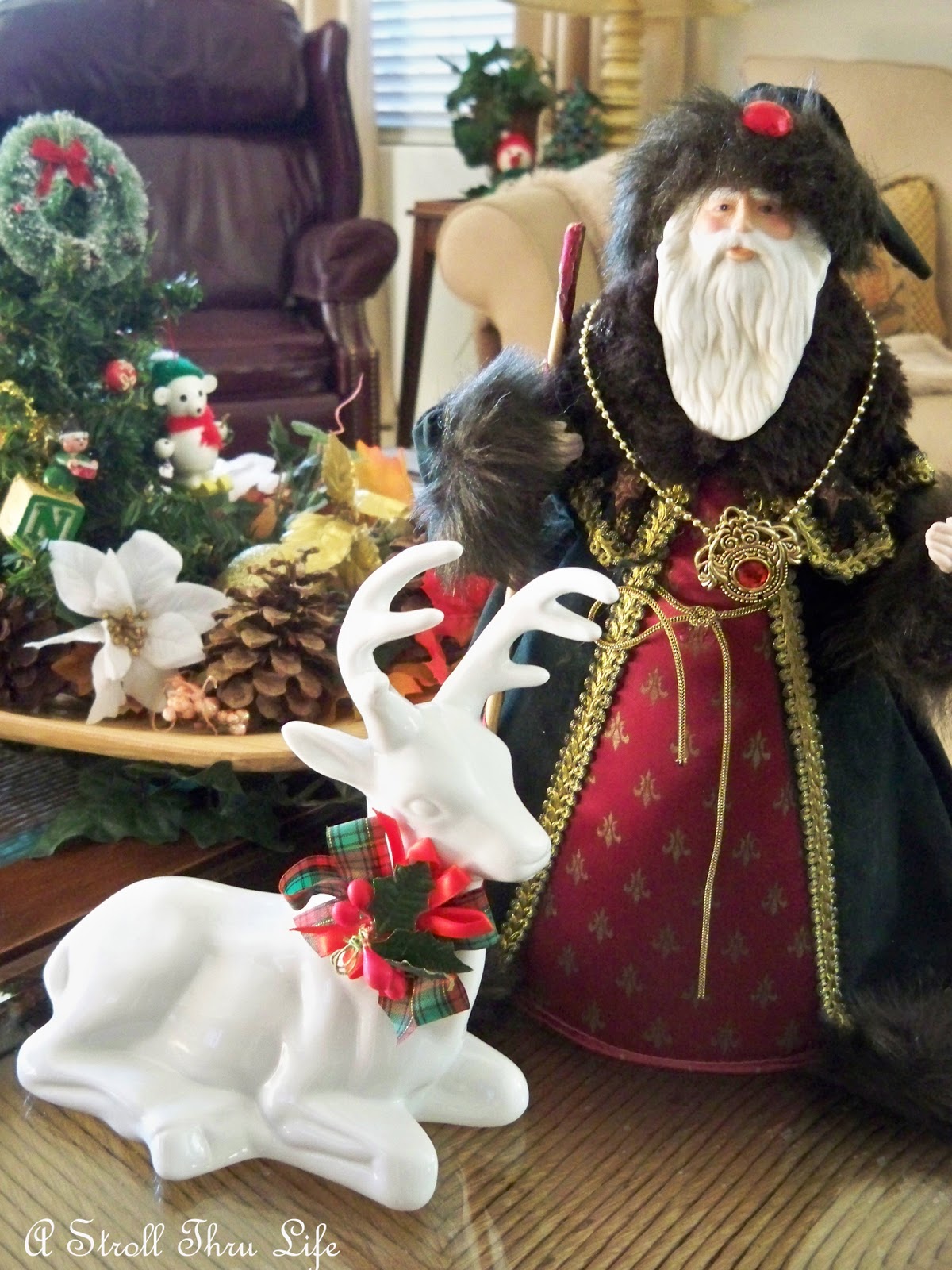 I ran out of steam by the time I got to the family room, so the coffee table got a bit of a thrown together display. My newest Old world Santa and Reindeer that I found at GW was my start, then the beautiful huge Poinsettia that I bought just up and croaked. I was so bummed. I got out the dough bowl and put a little tree and a bunch of foliage and balls in it and called it good.
