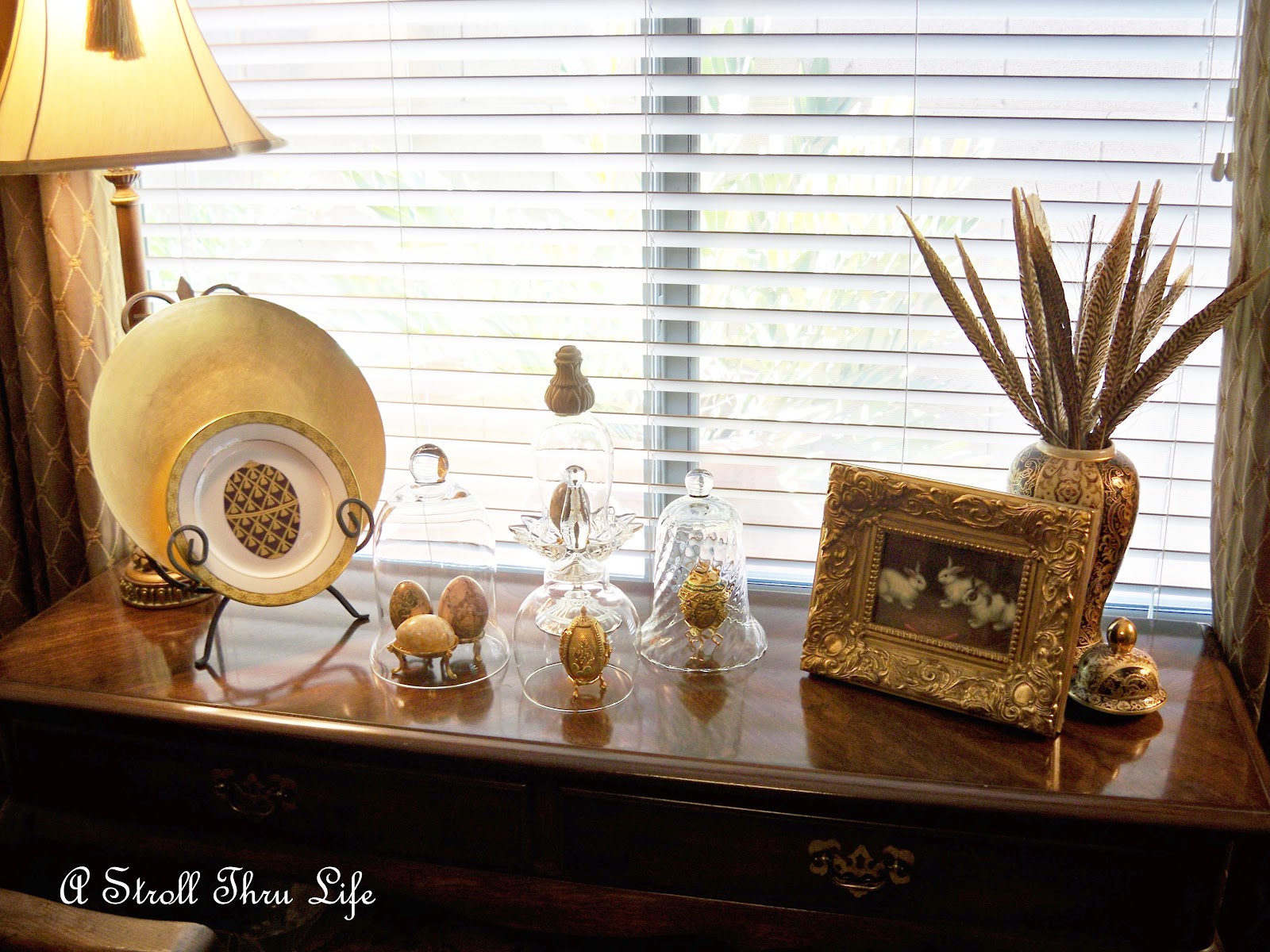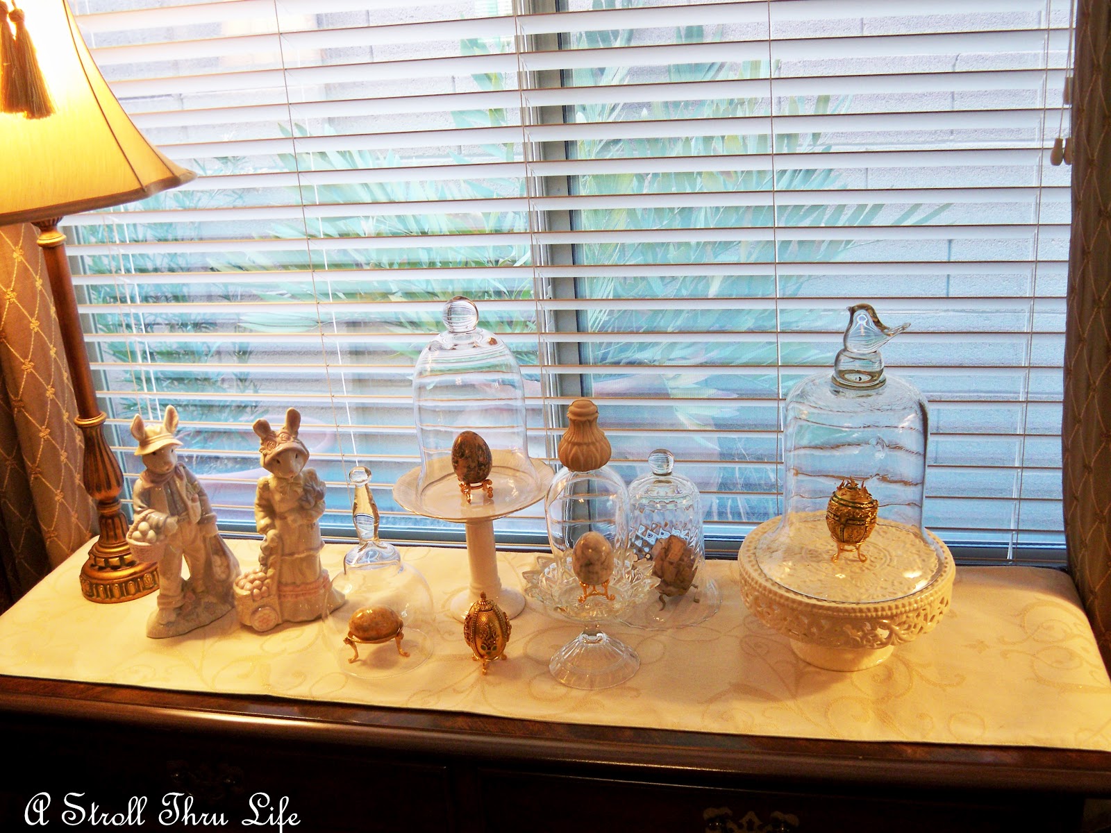 Sometimes you have to try a lot of different things to get the look that you want. I have a bunch of cloches and some wonderful Marble and Fabrege eggs that I want to use in a display for Easter on the dining room buffet.