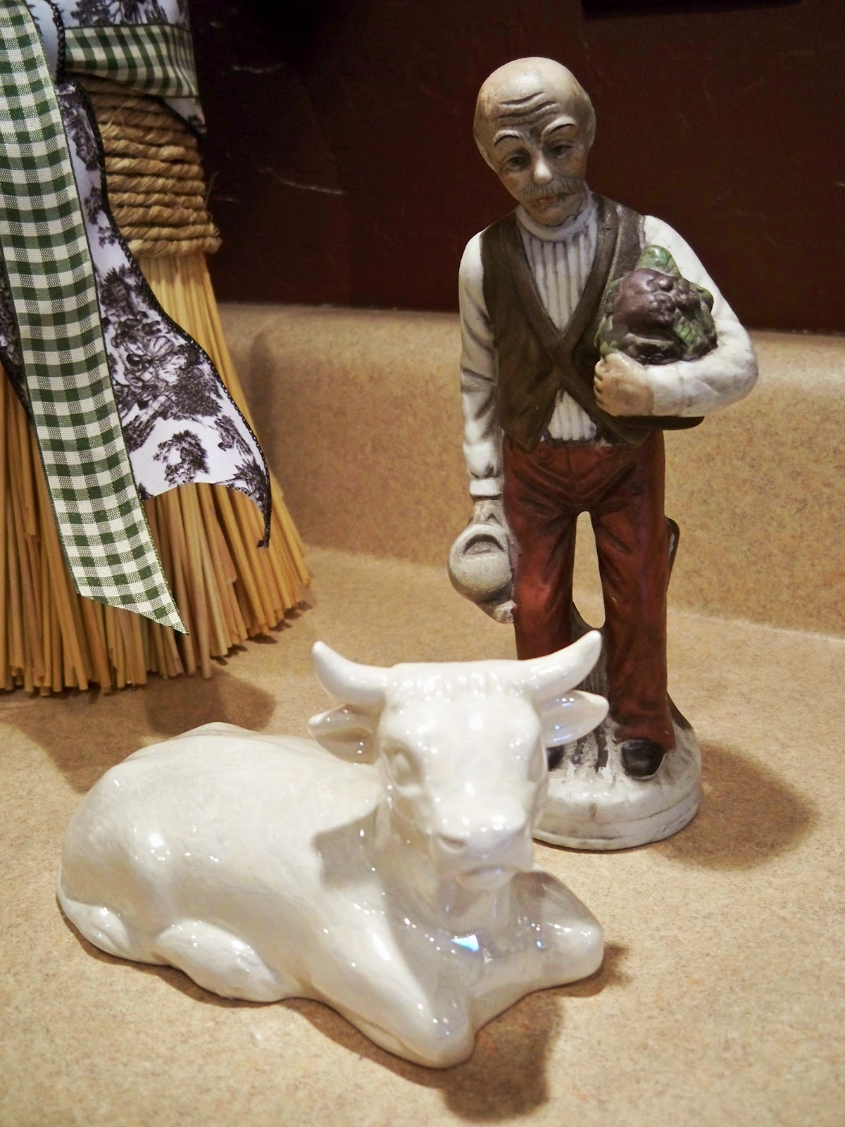 I found another little frenchman, this one is carrying a jug and a basket of grapes. Love his cute little outfit. The cow is also a great find, I love to use them in different vignettes.