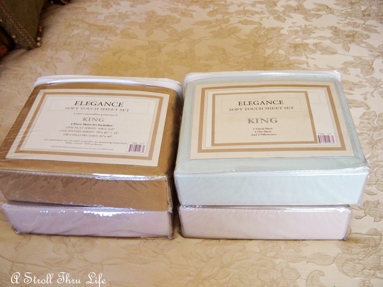 I needed some new sheets for our bed, so I had been keeping my eye out for a bargain. Then at one moving sale that I came across there were 4 king size sets of sheets for sale and for $10 a set. I bought them all. (The camera made the colors look strange, there are 3 beige and one blue.)