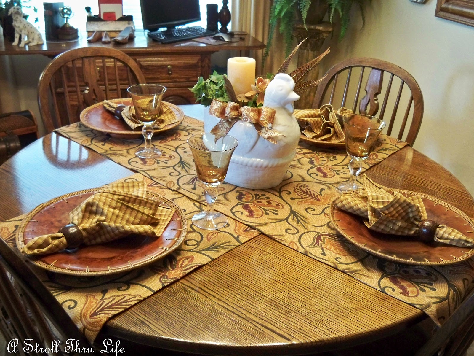 I was previously just using one runner and the rooster on the table. I made these runners years ago and decided to put them both back on and do a mock setting.
