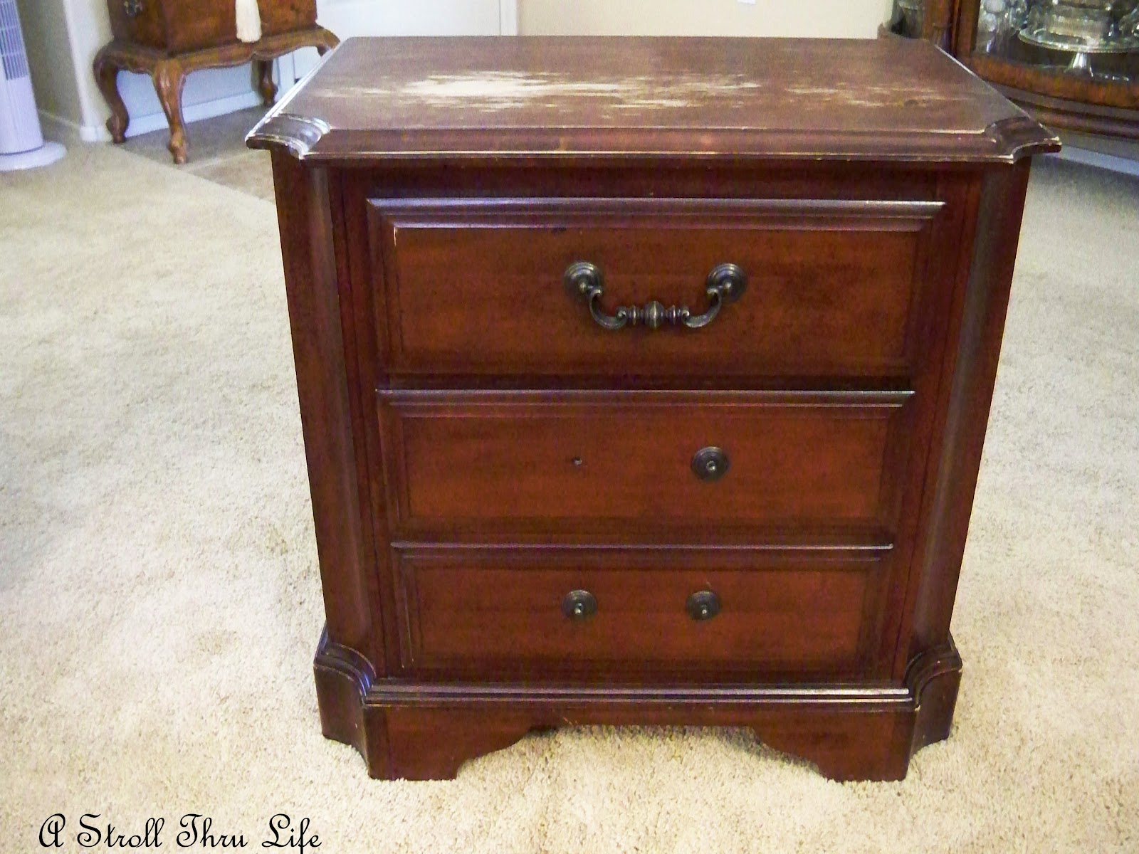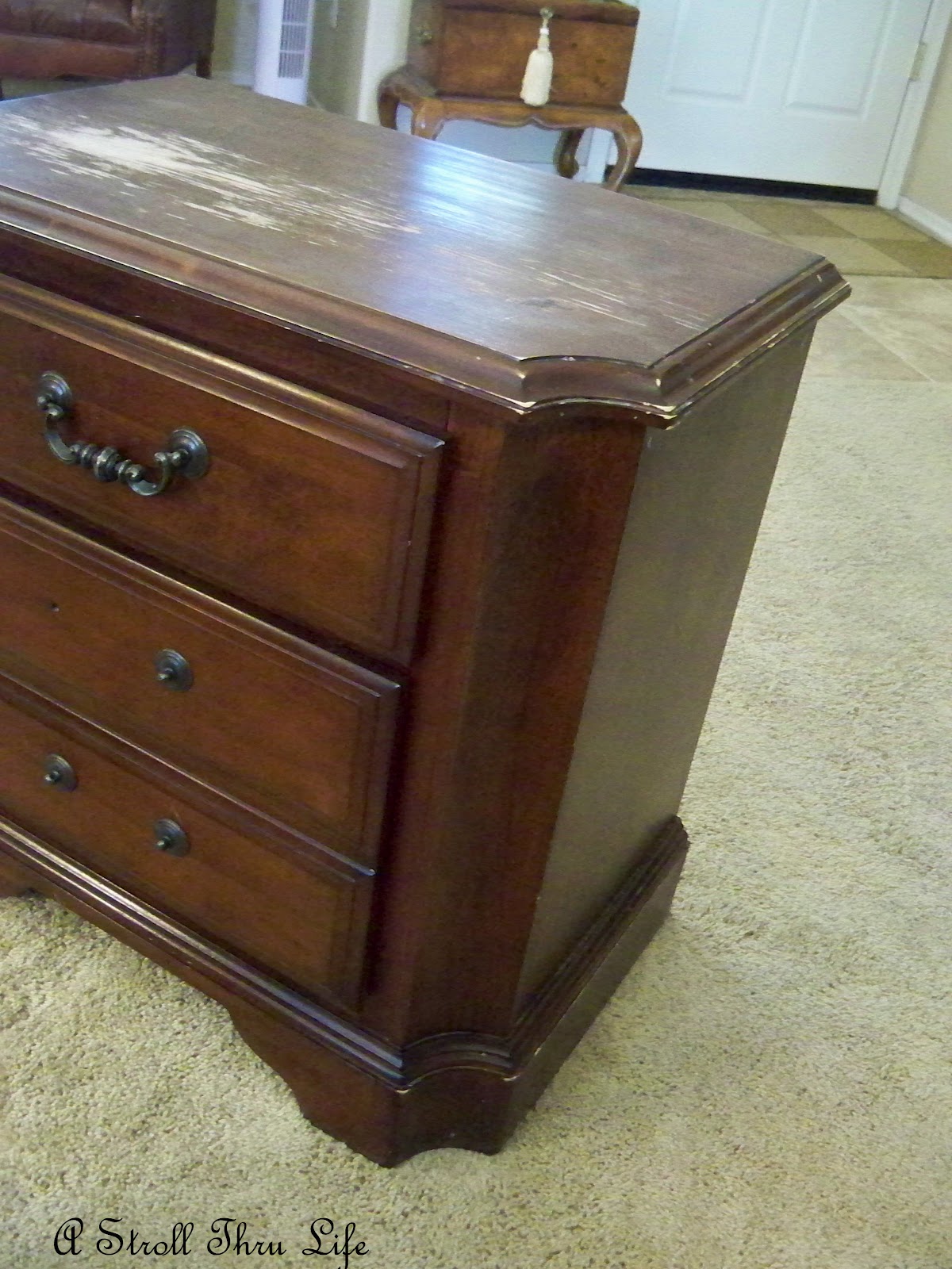 There are a few places on the sides and drawers that need to be touched up and as you can see, the top needs to be completely refinished. It has a nice solid wood top, so it will be easy to sand down and re-stain. Can’t wait to get started.