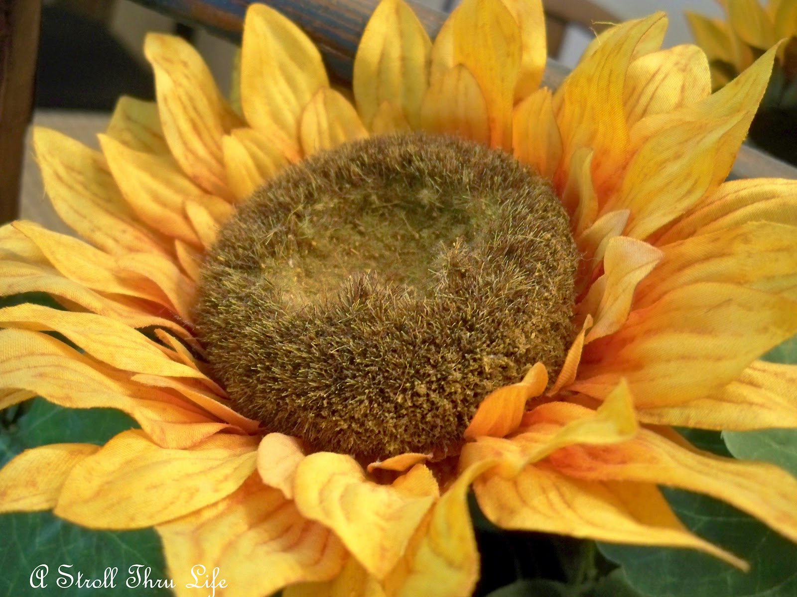 I love the look of sunflowers, but I don’t have any real ones, just the faux variety. At any rate, I love even my faux. With summer here, it was time to get out my dad’s tool box and enjoy my sunflowers again. They just make me smile. A tablecloth for some added color too.