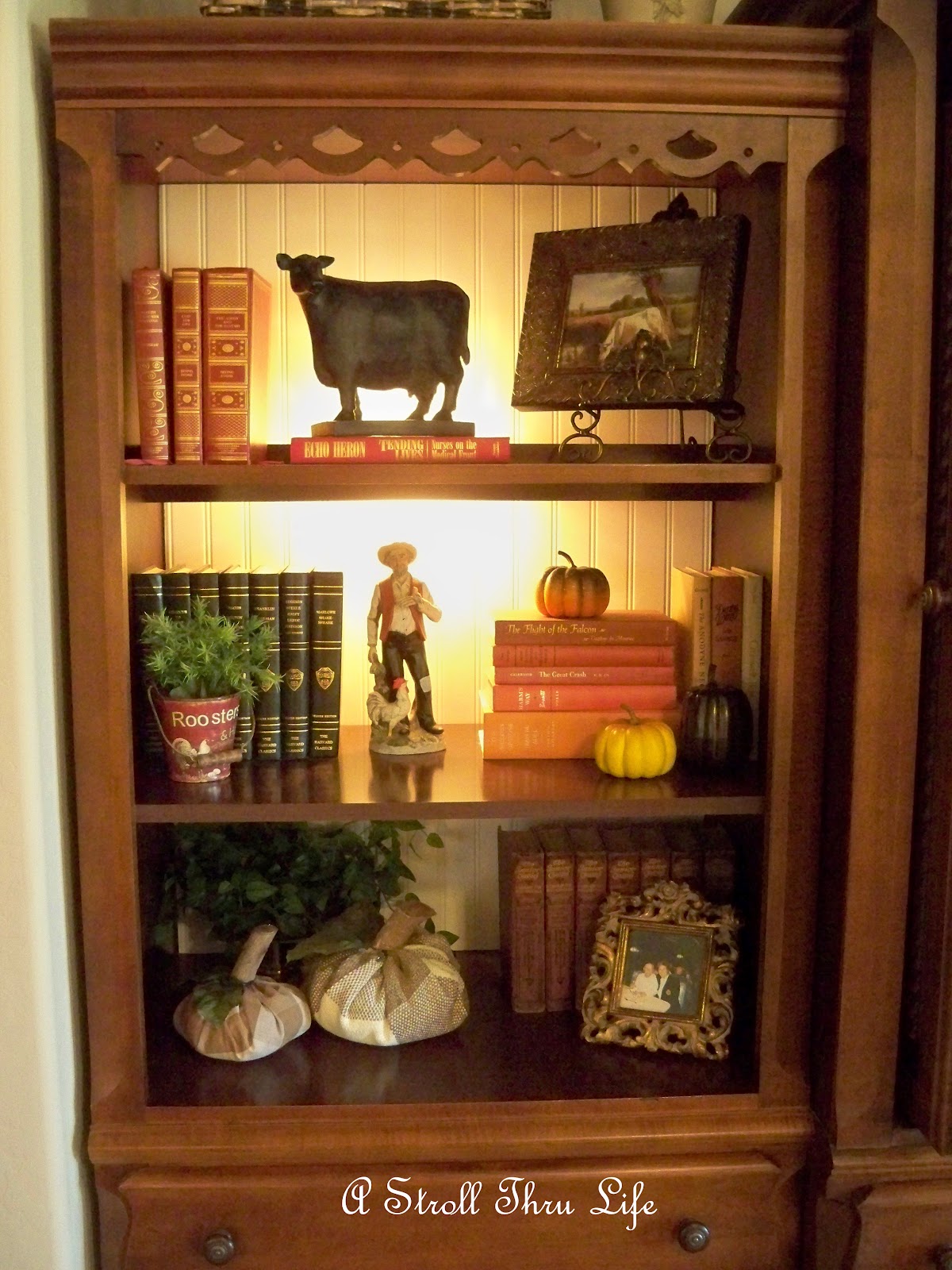 Seems I have two different themes going on in my bookcases. Sort of weird, but then so is life sometimes. I was trying to add a little fall to the bookcases when I noticed, they have absolutely nothing in common. I think I was in the process of changing the bookcases when I got caught up in getting the guest bedroom all ready for my son. I never got around to changing both sides. I have walked past this a million times and never noticed.