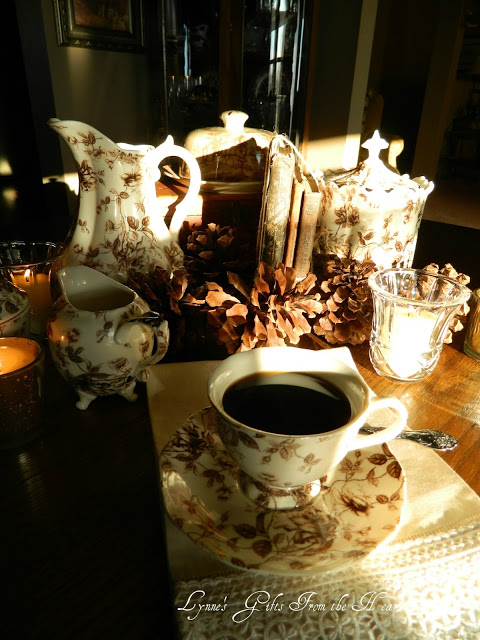 Is this picture fabulous or what!!!! Be sure to visit Lynne’s Gifts From The Heart to see this stunning vignette and more of her fabulous pictures. Love that brown and white transferware too.