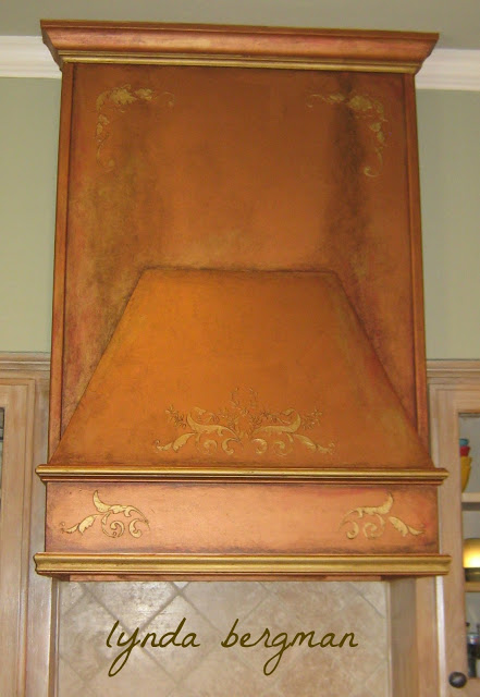 Isn’t this just amazing!!! Lynda Bergman painted this gorgeous stove hood to look like copper. Stunning.