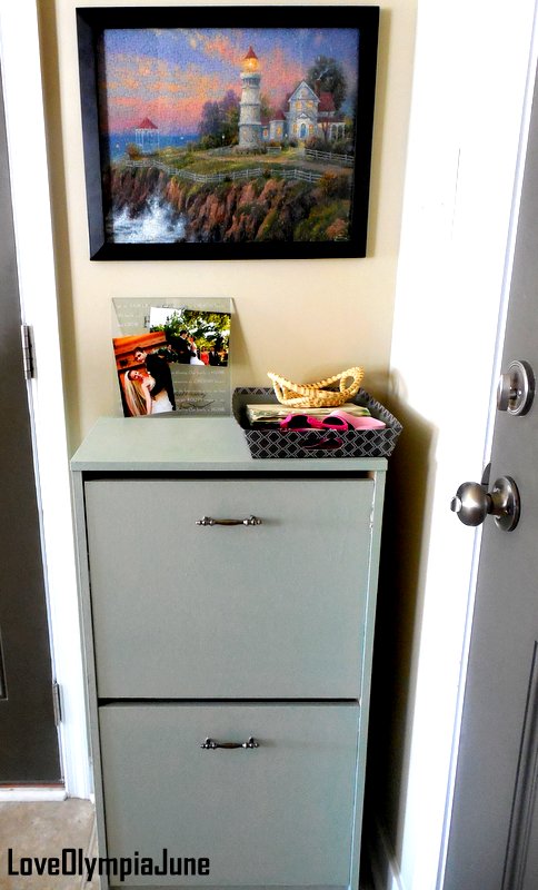 We have our IKEA shoe storage (which I painted and added handles to), umbrella holder, and some other needed miscellaneous items for easy grabbing when you need to head out the door.