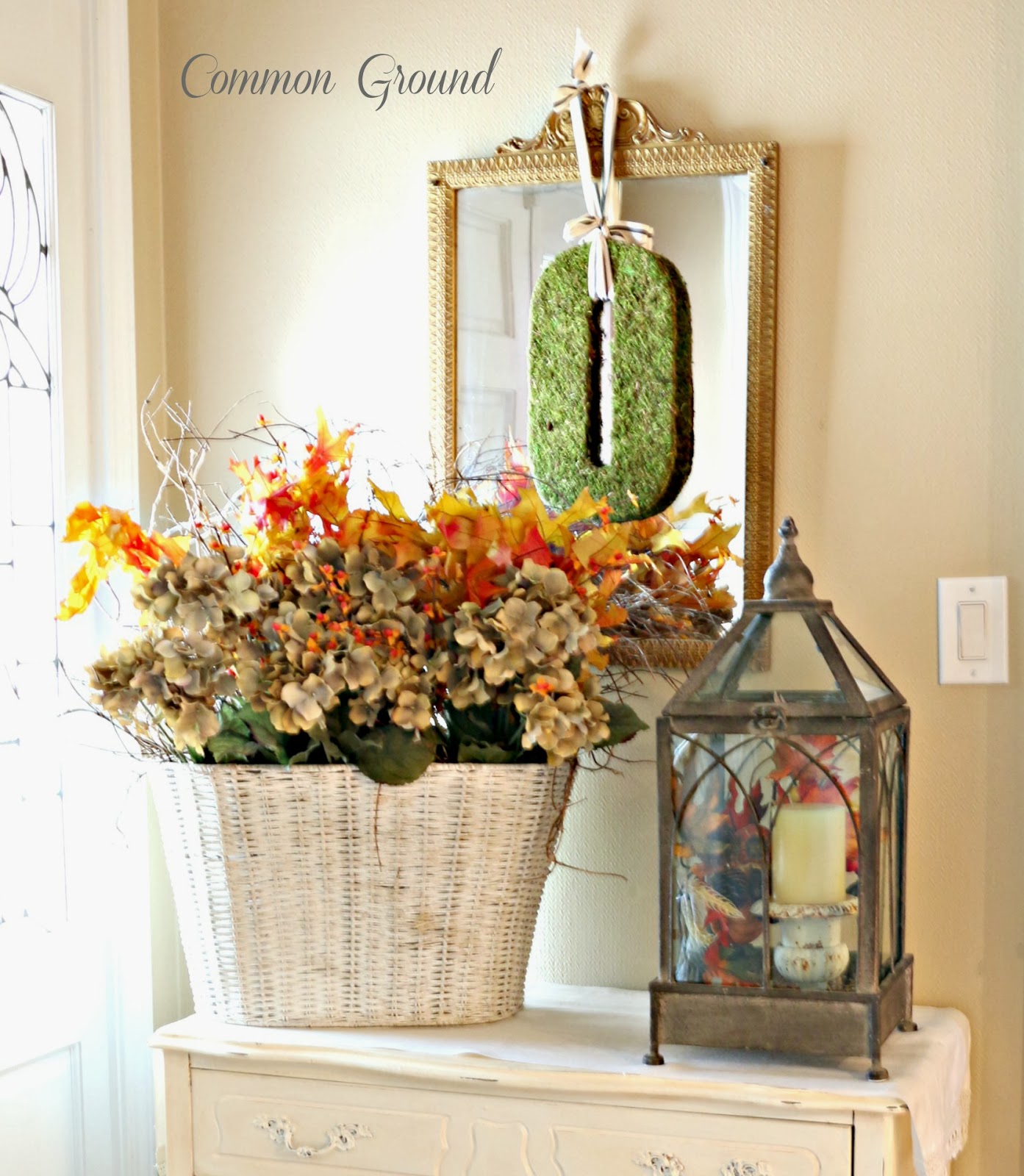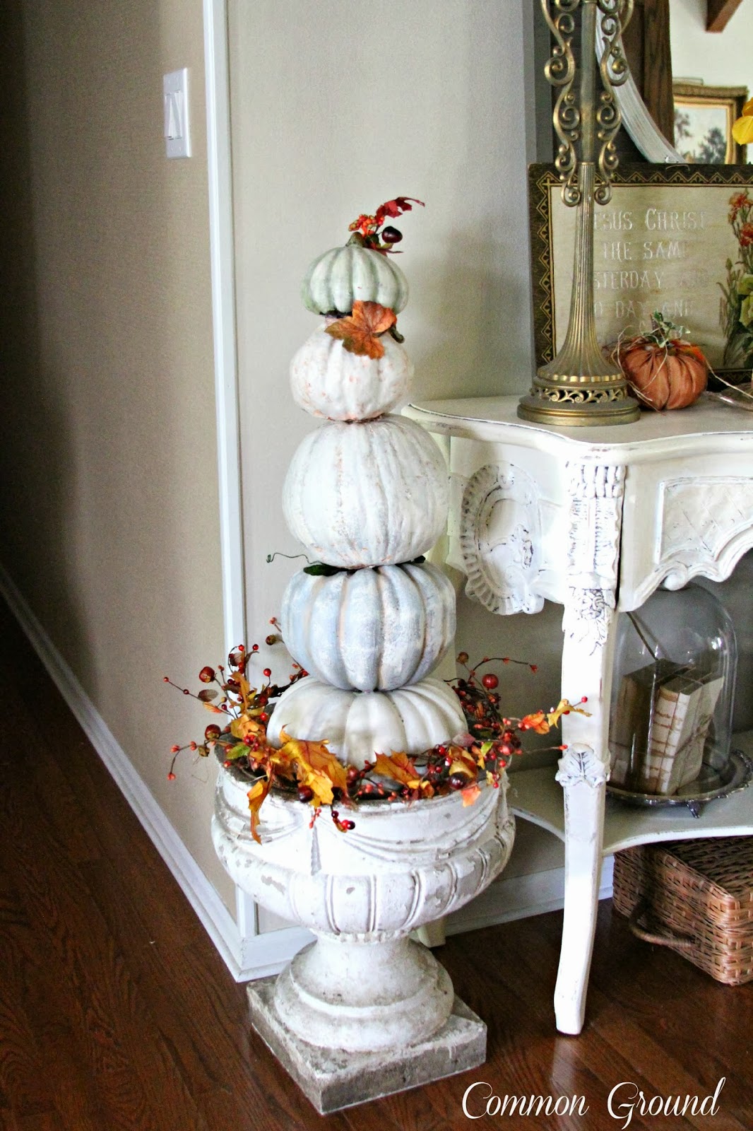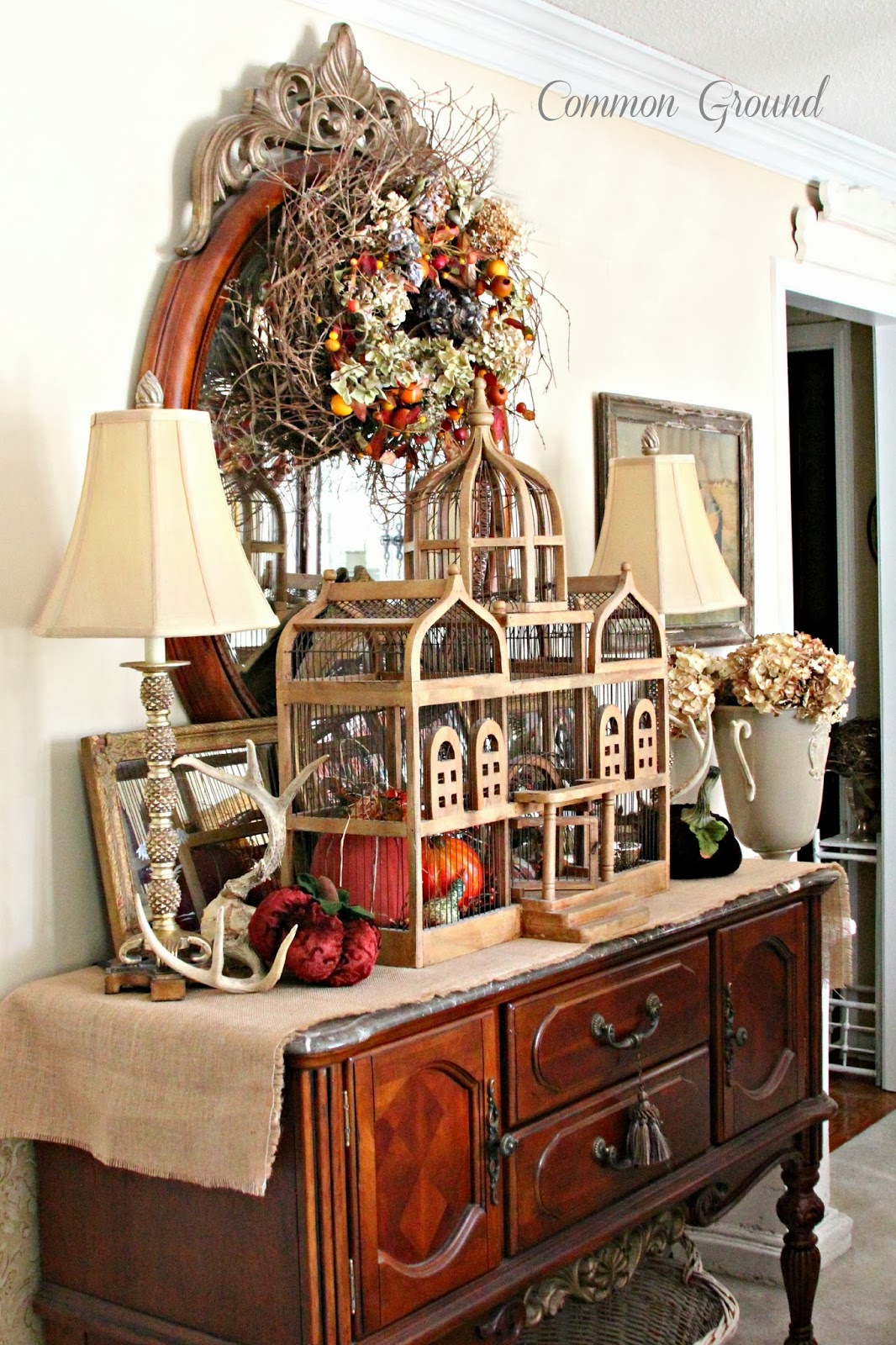 Today I am absolutely thrilled to have Debra from Common Ground as my feature. She is such a talented lady and loved by everyone in blogland, so being able to Show Off and Brag about her a little is such a pleasure. Her home has inspired most of us in some way, either by her style or her diy projects. It is such a delight to have her share her Fall decor with us today. So settle in while this gracious and lovely lady takes us on a tour.