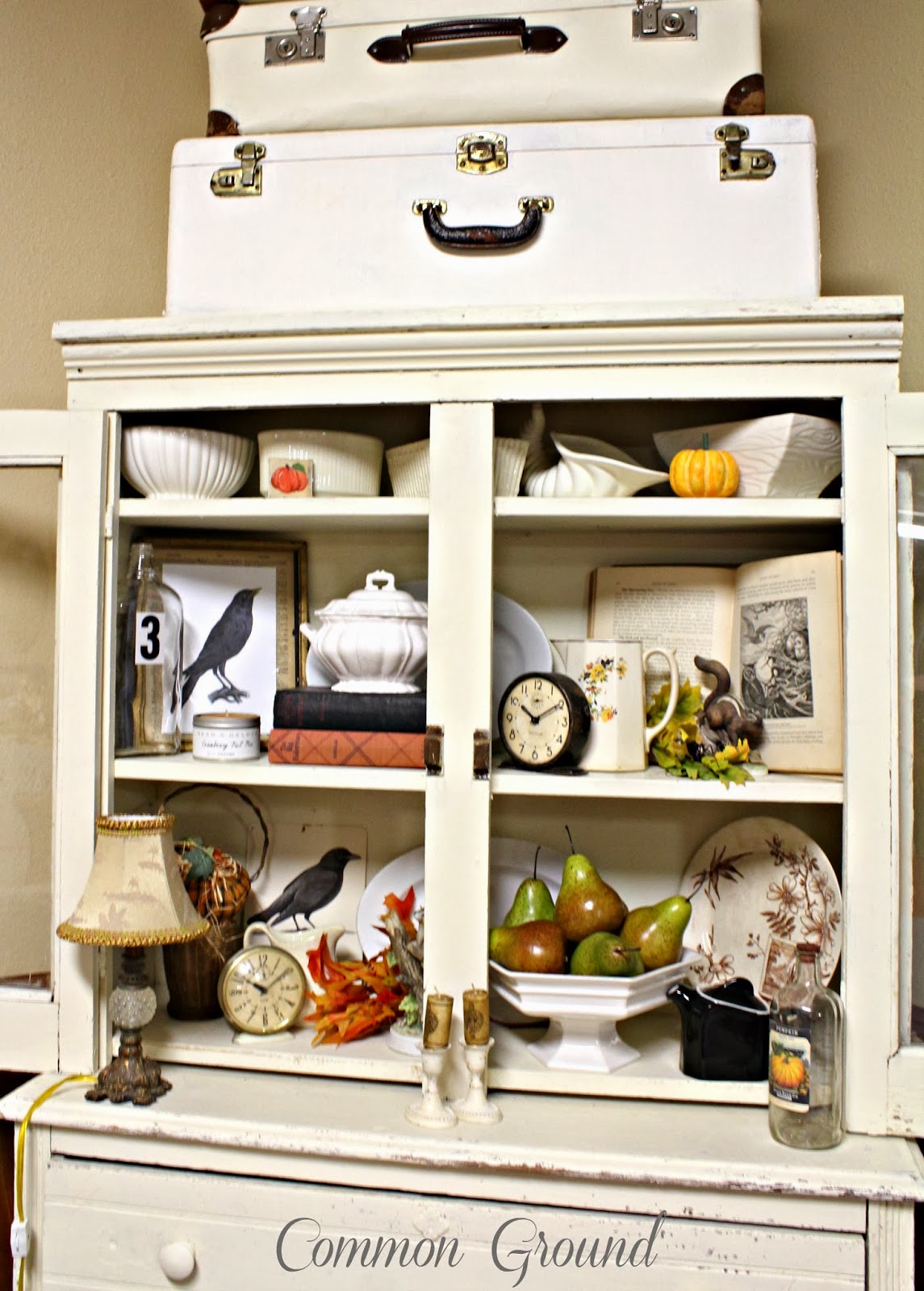 I really enjoy styling and display, and miss having an antique space, so right now I just try to enjoy decorating all the nooks and crannies around here. One of my favorite seasonal areas to have fun with is my “Holiday Cupboard” in my downstairs sitting area. Here it is decked out for Fall last year.