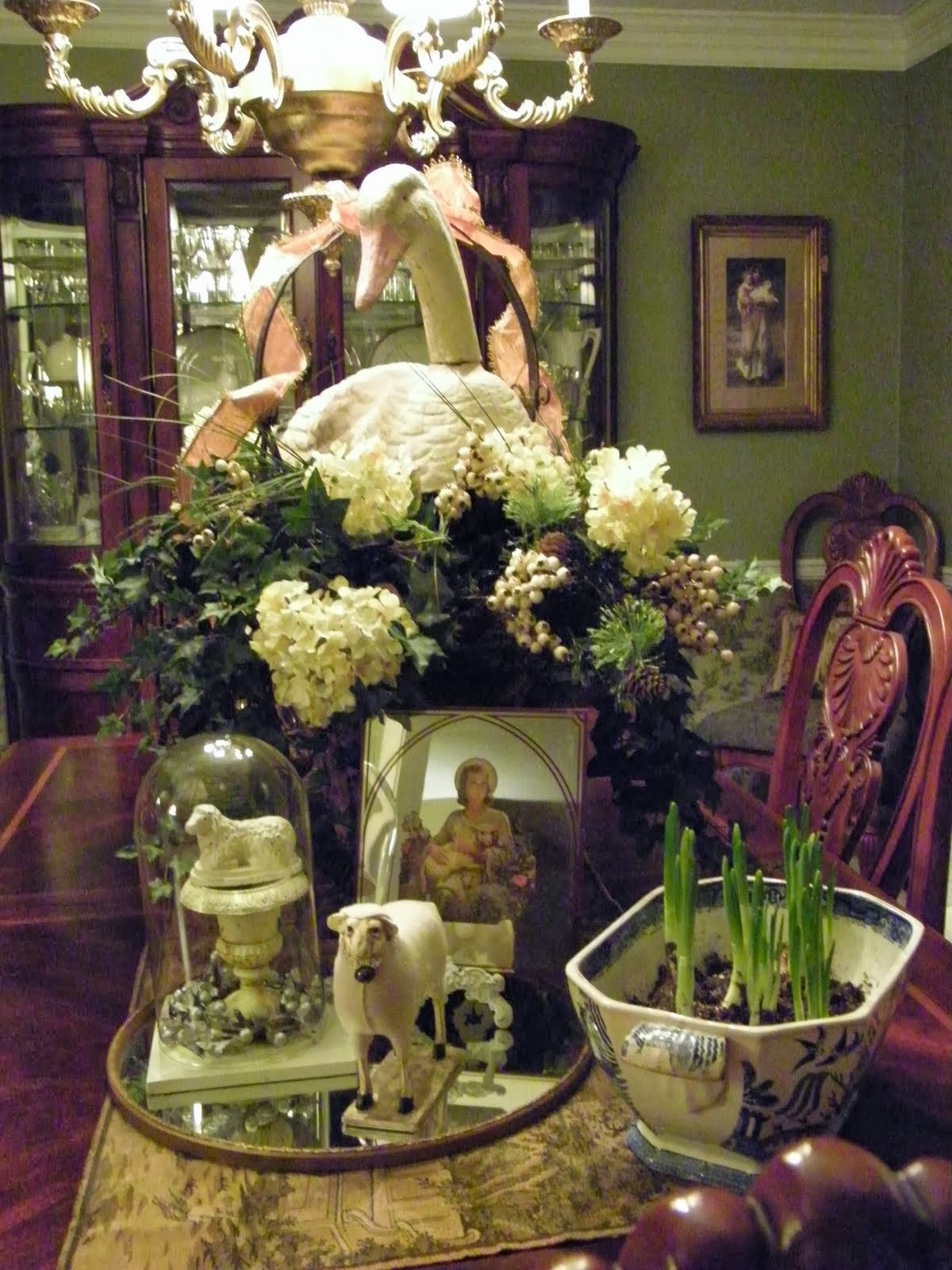 Our home is 31 years old, and is very traditional, with a little French flair. I’m big on letting the architecture and styling of the home be a guideline for the furnishings and decor. My first love is “vintage”, so I like a mix of old and new playing off each other, as I have a lot of sentimental family antiques and keepsakes.