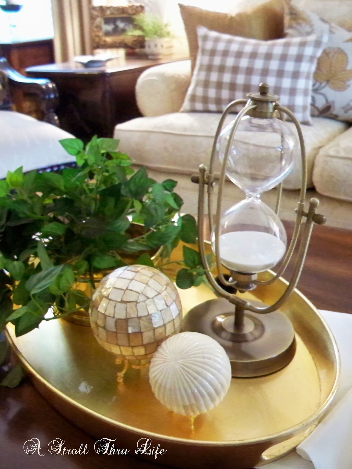 I moved the gold leaf tray that was in the family room in here. I kept the ivy plant in the brass planter and added the brass hourglass. I found a new marble chipped orb at Hobby Lobby on my last shopping trip so I added it to the tray with another small one I already had.