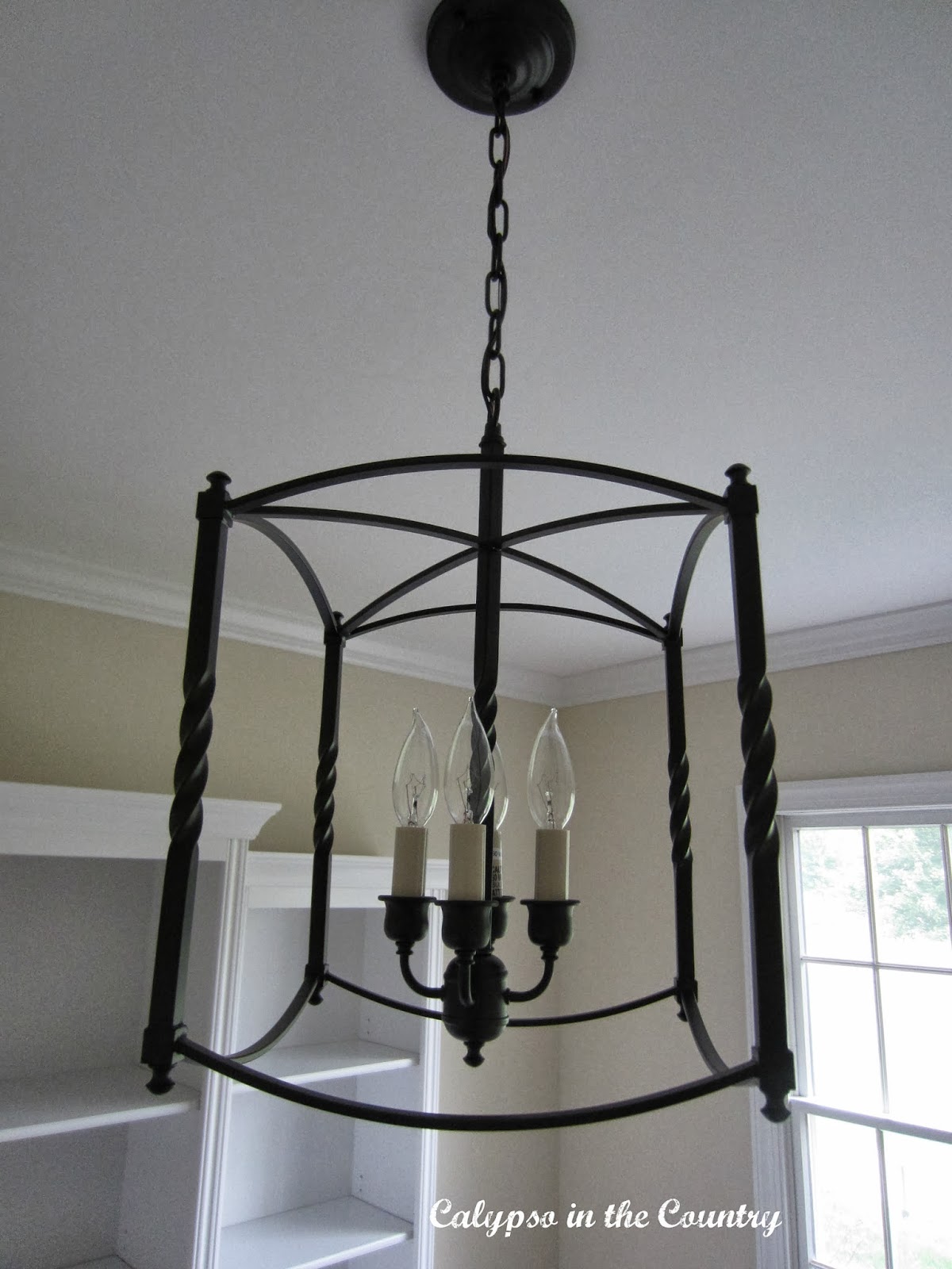 The lantern is the “Carriage House Chandelier” from Ballard Designs