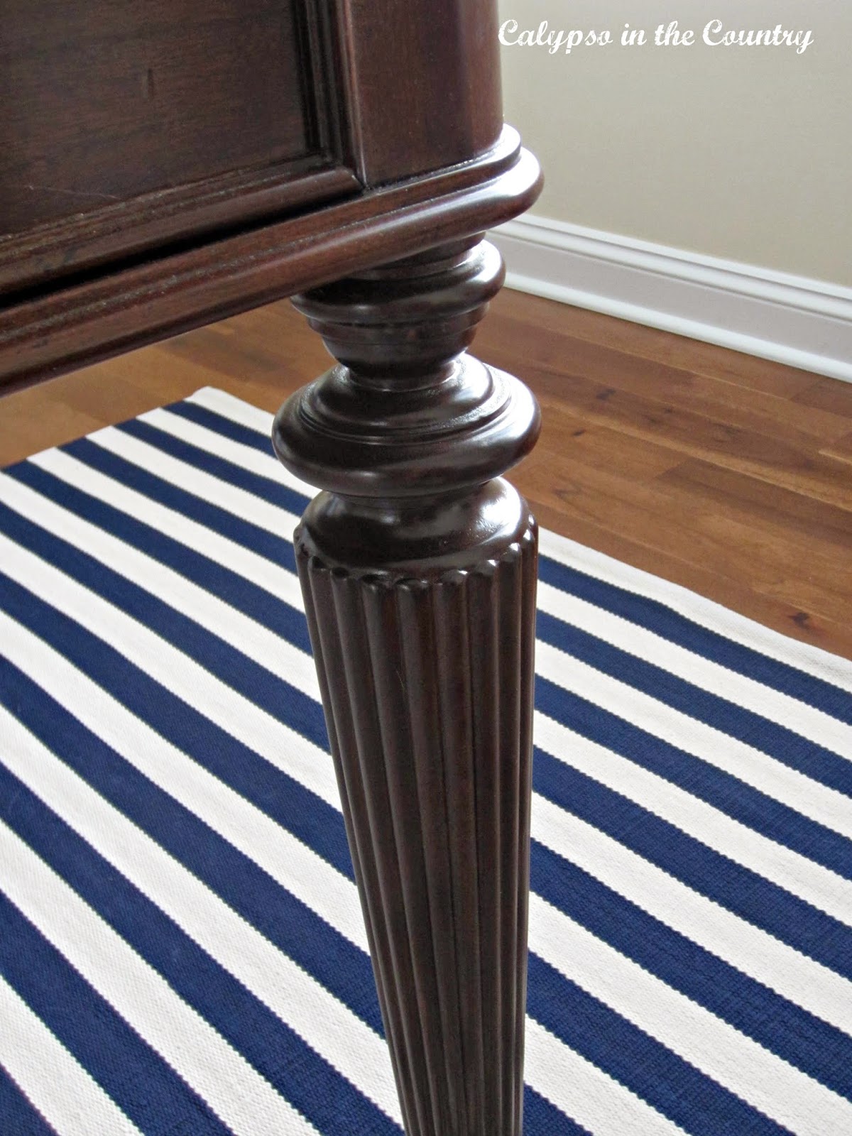 The blue and white rug is from Dash and Albert. The desk is from Hooker Furniture. I saw it online and then found it at a better price in a local furniture store. Originally, I thought I wanted a white desk, but as the room evolved, I changed my mind on quite a few things. I think the dark wood and fluted legs give it an island feel.