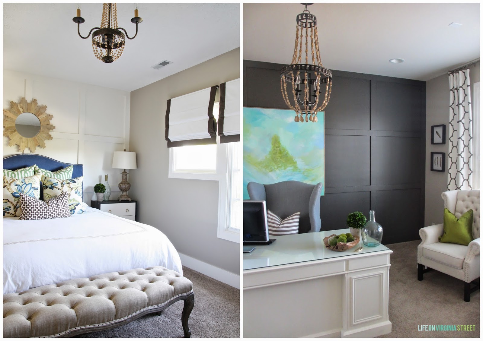 If you’re interested in checking out a few other room makeovers I’ve completed, I’d encourage you to start with my guest bedroom makeover or my home office makeover. Both rooms have also come a long way since the sea-of-beige that they once were! You can also see I’m a big fan of wall treatments, chandeliers and statement window coverings.