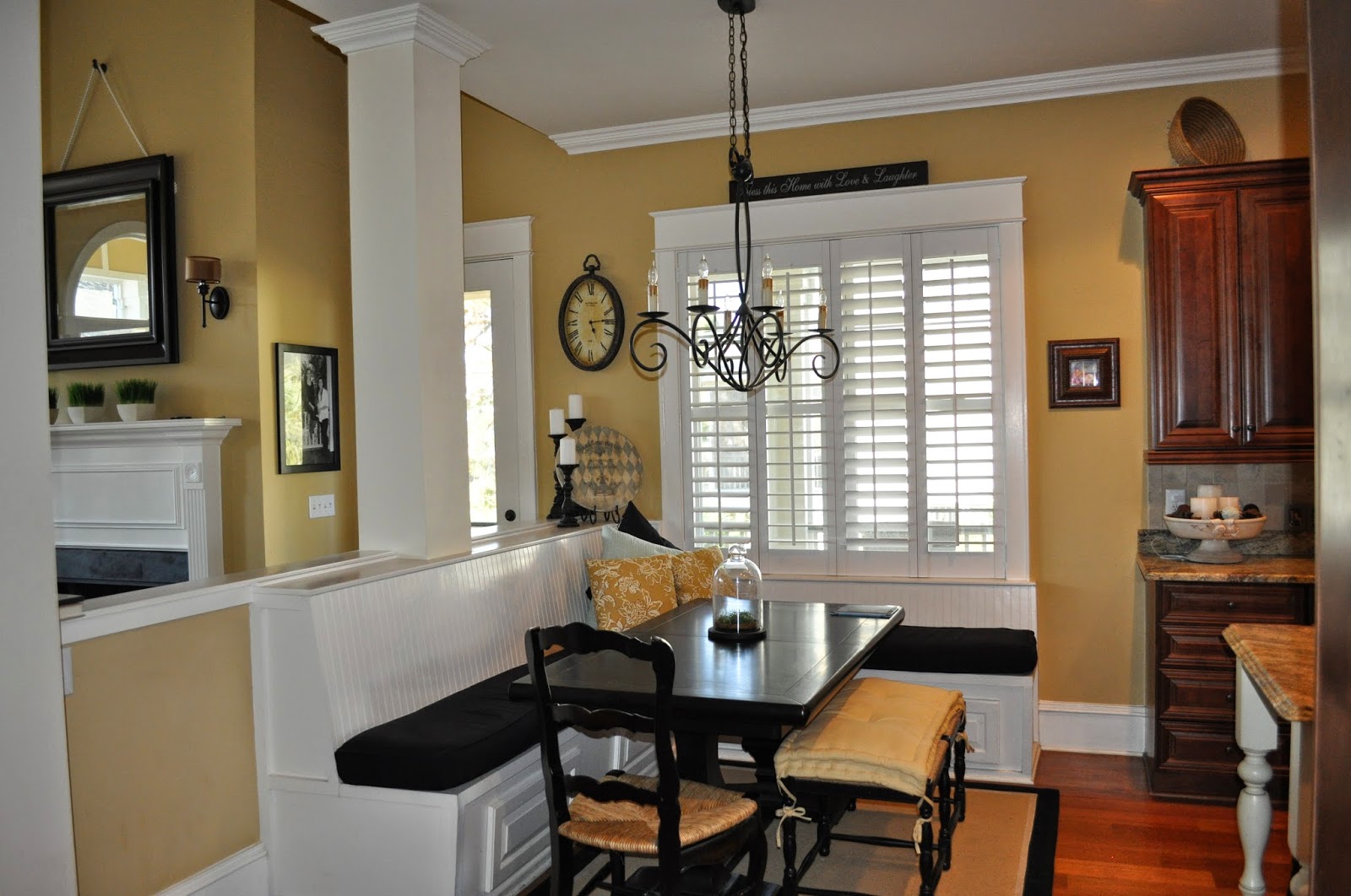 The kitchen doesn’t have a large space for a table. The nook was my initial decorating challenge. I had to find a table to fit with pedestal legs so people could move around the benches easily. I had the cushions recovered and replaced a drum light that came with the house. I chose a new light with flowing ironwork so it would compliment the open space of the room. Plantation shutters, pillows and accessories were added. I love my little nook now.