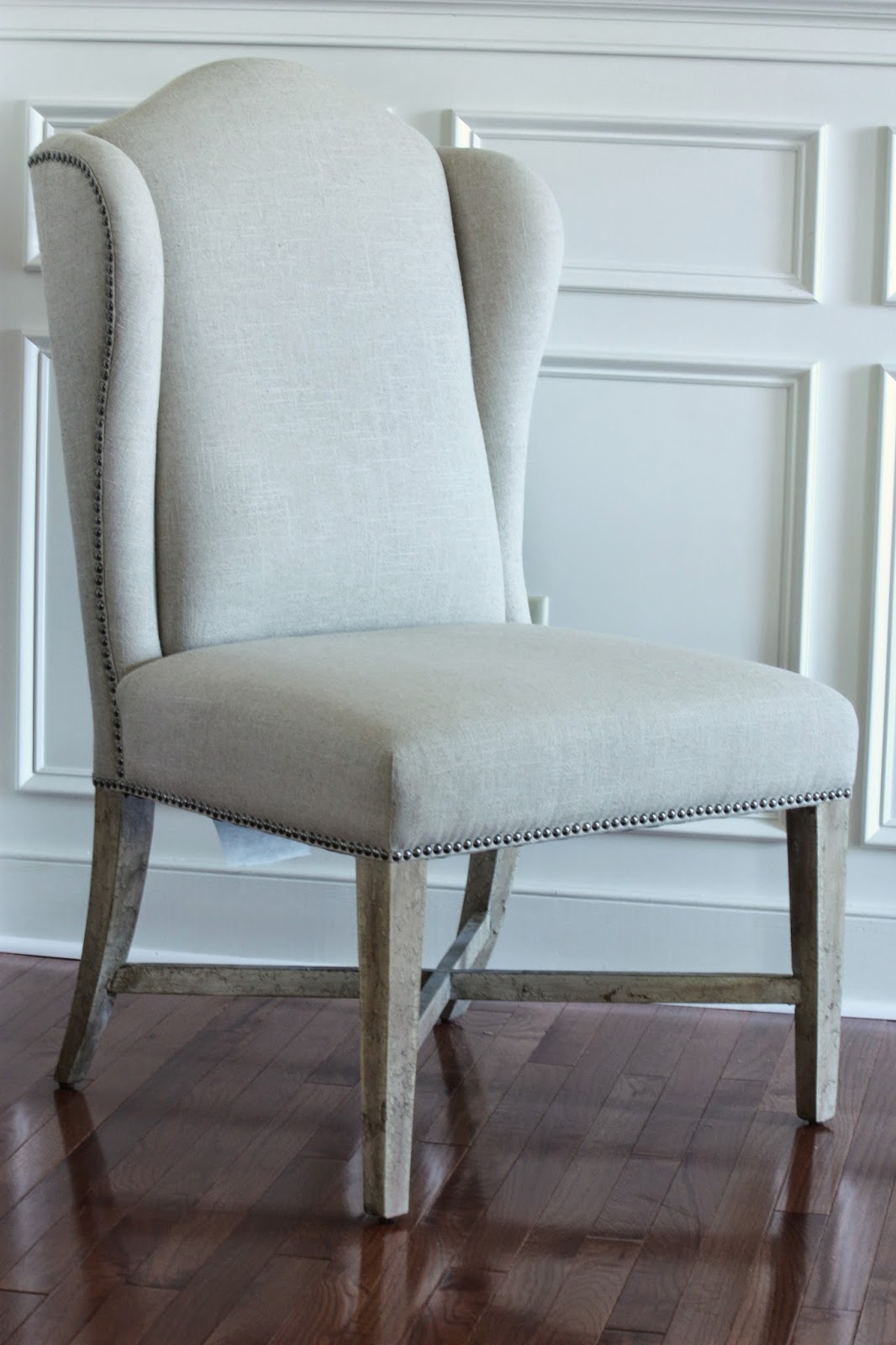 Along with the new chandy came new head chairs… I wanted a pair of modern linen wing backs with nail-head detailing! I found these from Hooker.