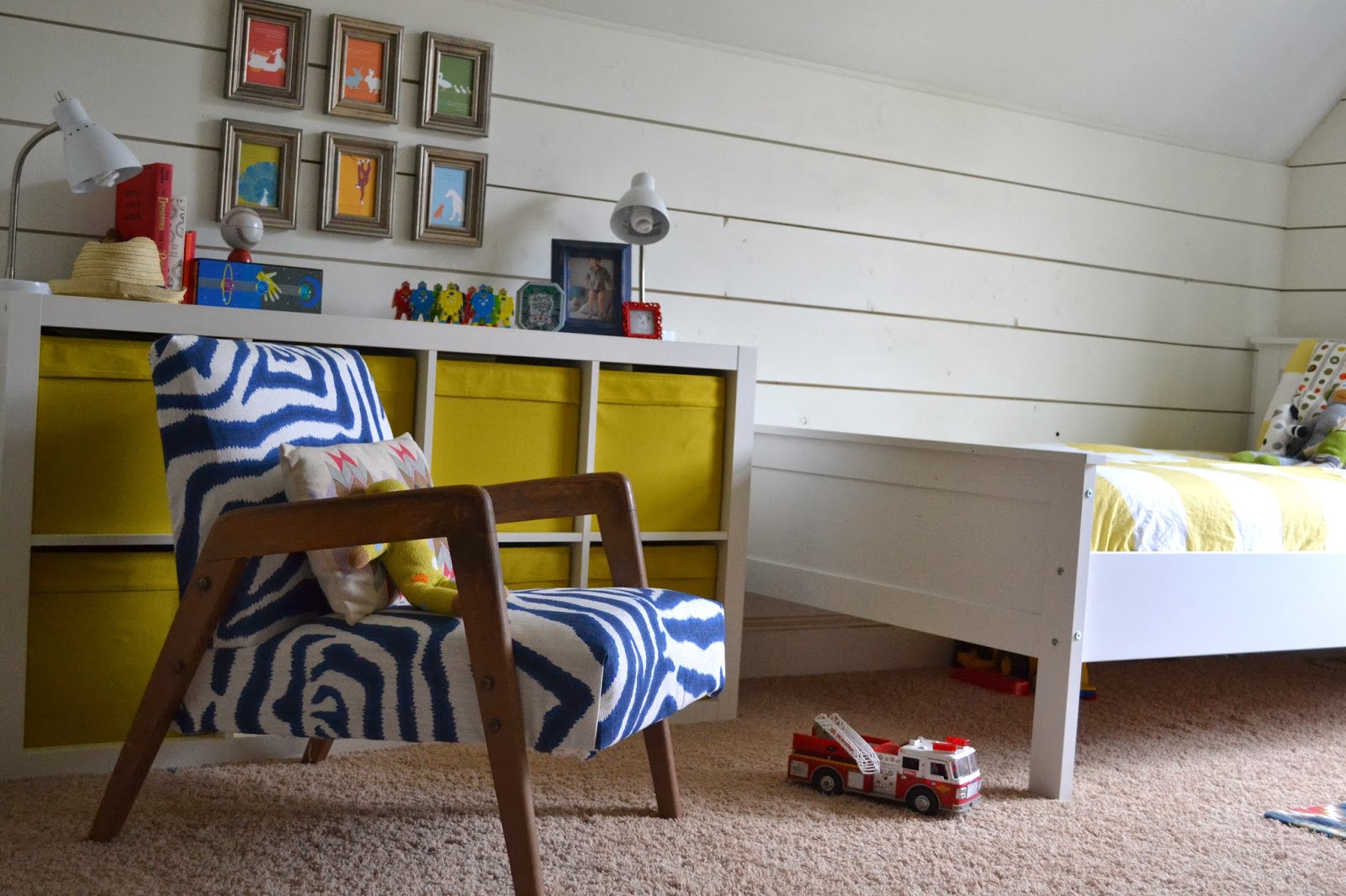 So to pull this room together I chose patterns that would be repeated throughout the room (and hallway), bright colors to make the space feel happy, and a mix of old and new pieces.