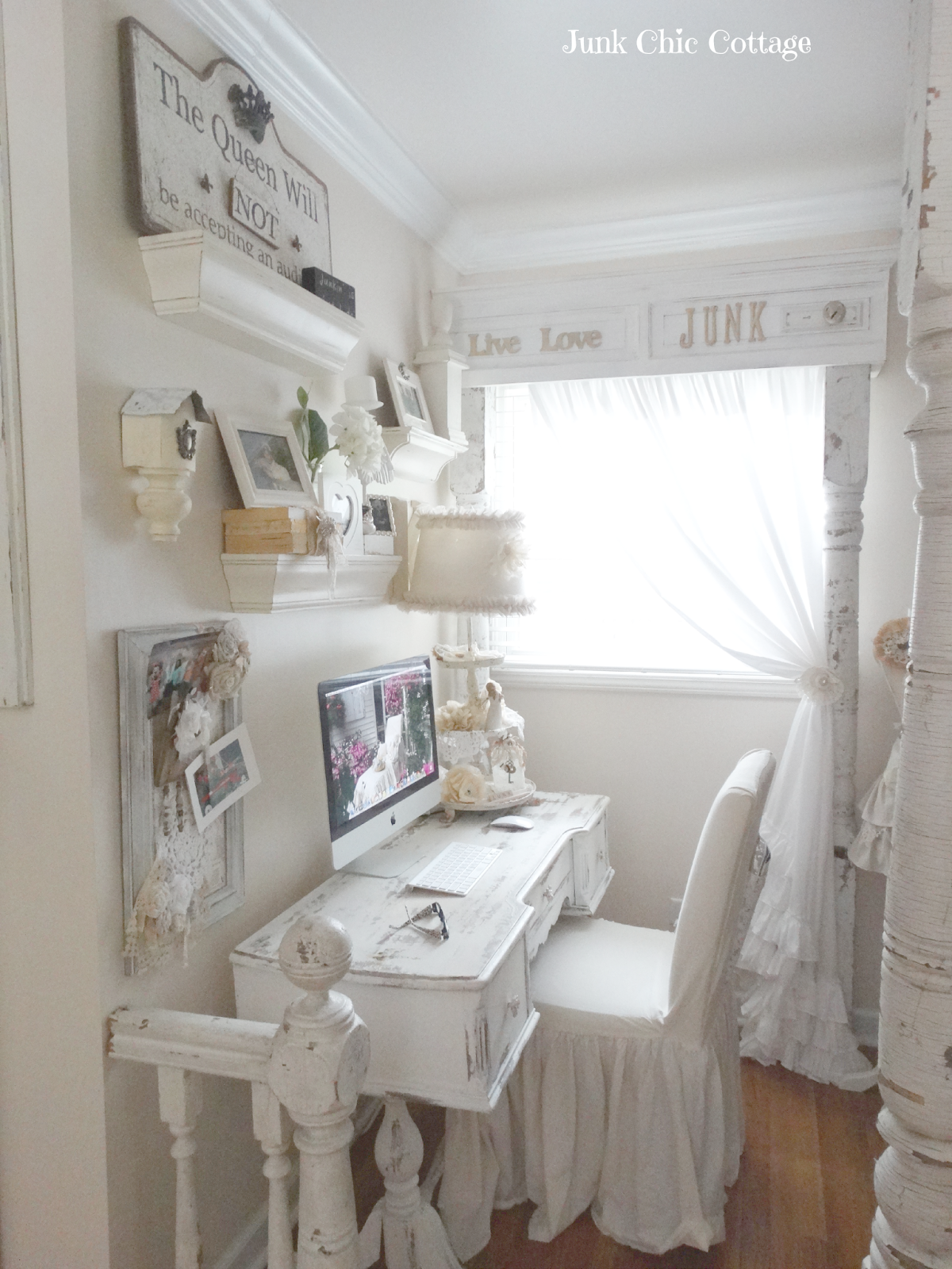 This has to be the most feminine and girly office I have ever seen. You need to go see all the unreal attention to detail. So fun!!! Junk Chic Cottage has done it up right.