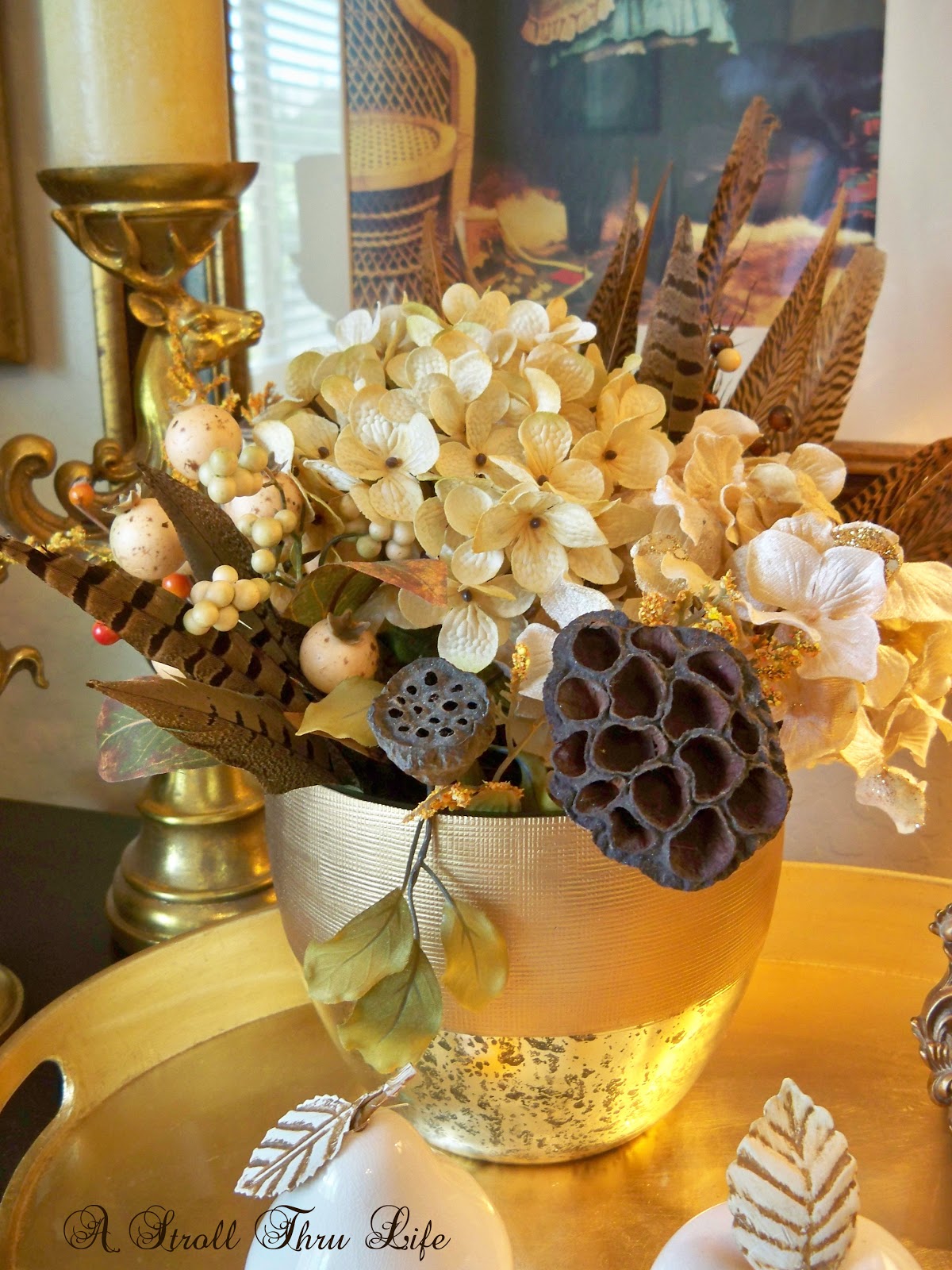 I wanted to use some of my BD treasures so I created a new vignette on the dresser. I love this planter, gold and silver, so how could it not be fabulous. Feathers, hydrangeas and pods are the perfect arrangement.