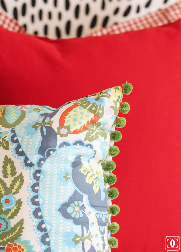 On top of functionality, I wanted FUN! I wanted a space where my daughter could play and there were bright and exciting colors and patterns that encouraged her imagination to run wild. I wanted a space where I could work from home and feel creative and inspired. And last, but not least, I wanted a space where our guests would feel welcome and excited to be with us. I achieved this by mixing classic patterns like buffalo check with the fun floral from Amy Butler…and lots of pom trim.