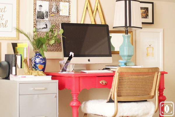 Now for the office space. I work from home, as well as blog from this little space, so I really spend quite a bit of time here daily. I needed the space to feel creative and feminine, without straying from the overall design of the room. I added in a little leopard print to be unique to the space, but the real star is the red lacquer desk. It was passed down through my family and I just couldn’t get rid of it, so I gave it a big ole’ update. The chair was a thrift find that I sprayed gold and re-upholstered in a fun fur. You can read more about the before and after’s of the desk and chair here.