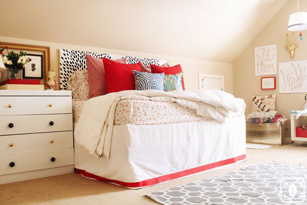 We found that positioning the full size bed that was originally in the room as a daybed really opened the space up. The headboard is a very easy DIY using fabric from IKEA, plywood, batting and a staple gun. We attached it to the wall using a large Z bracket.