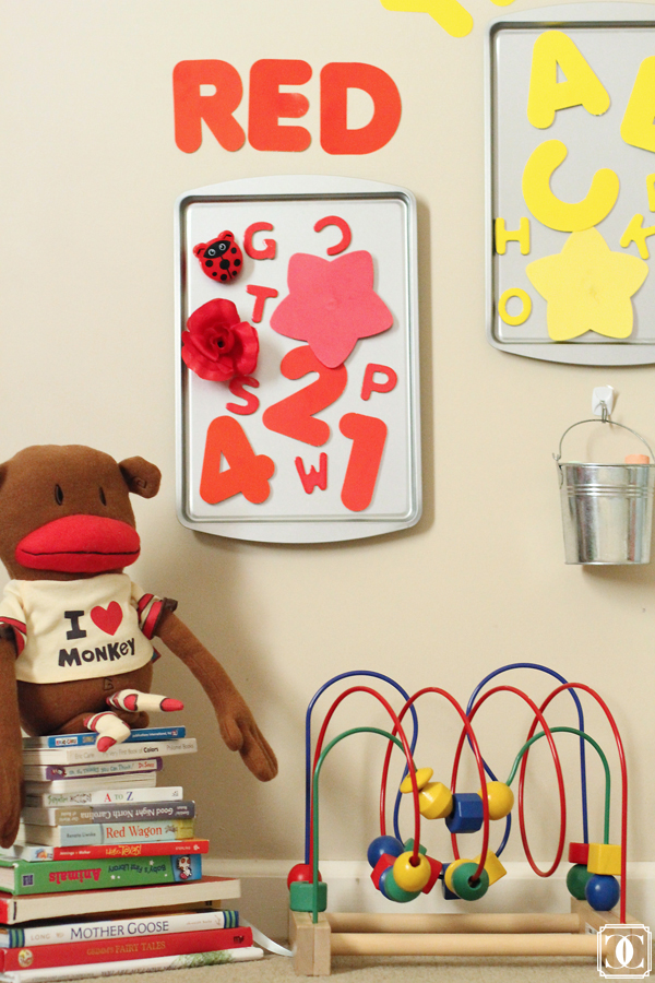 I recently completed this project for the room on the wall to the right of the window (same as office space). This was just about the easiest project, using Dollar Tree cookie sheets to create a sorting wall to help her learn colors. See the full project here.