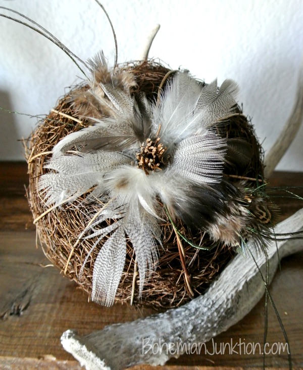 Since we are in a budget mode, if you are looking for inexpensive and unique decor for the holidays, how about this fabulous feather pumpkin that Bohemian Junktion created. Love this idea and $1 is the perfect price.