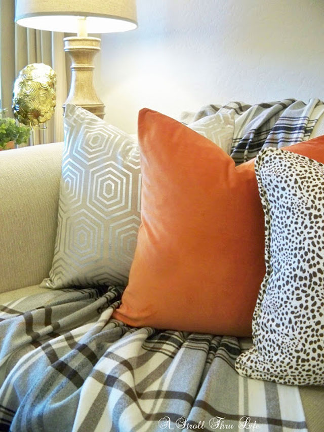 (Ikea Throw – Hobby Lobby Silver Pillow – World Market Orange Pillow)