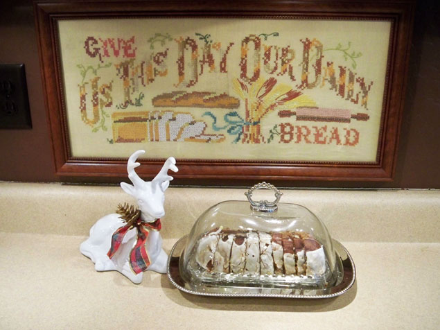 A small rheindeer sits next to a cloche with some pumpkin bread. Simple and easy decor with just a few leftovers.