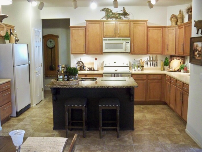 You guys also suggested that I need to recover the barstools to something lighter, so I placed a couple of napkins over them to get a perspective and you are totally right. While I was at it I added a little fruitwood stain that I had to the legs of the stools and I like them so much better. They don’t fade into the island so much.