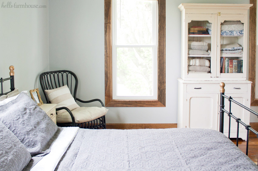 If you saw my little 18″ wide linen closet then you know that I could use a piece like this. Hello Farmhouse turned this fabulous chippy cupboard into the perfect linen closet. Bulky items on the bottom and fun linens and books on top.