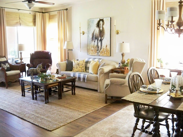 It has the same yellows, browns and grays that my furniture and accessories have. I didn’t reinvent the wheel, I just put the room back the way it was.