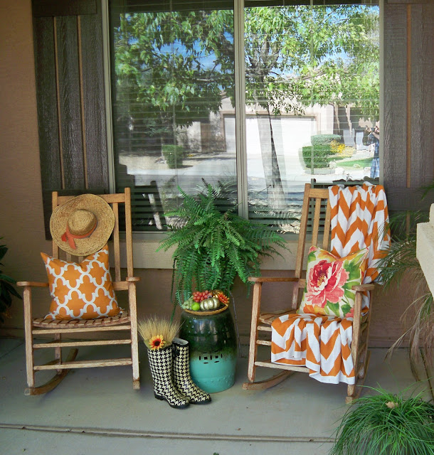 I don’t do a lot of Halloween decorating, but I do like to have some pretty Fall on the porch that has some of Halloween’s colors. Switching out a few pillows and the throw is always my favorite way to go. This pretty pumpkin color reminds me of the leaves and how they are beginning to change.