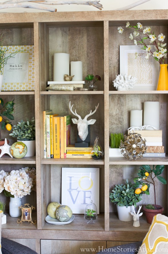 I like to mix mine up with books, collectibles and all kinds of different accessories and elements. You can use the same things over and over, just shuffle them around for a different look. I lined the back of mine with beadboard and totally changed the appearance of the whole unit. You can see that post here.