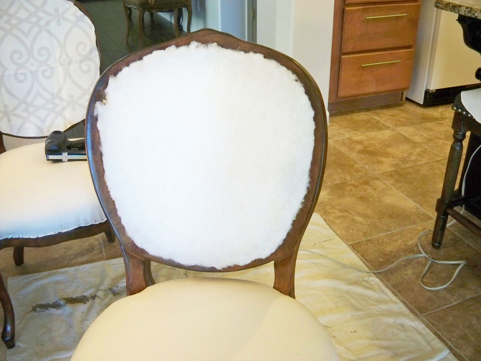 Miss Mustardseed has some of the most detailed YouTube videos of how to do this kind of chair. I watched several she had on how to remove all the fabric and then how to put the new back on. I used my old fabric that I took off the seat as a pattern. I did learn to cut about an inch larger around the fabric so you had something to hold onto to pull tightly as you stapled the new fabric back on.