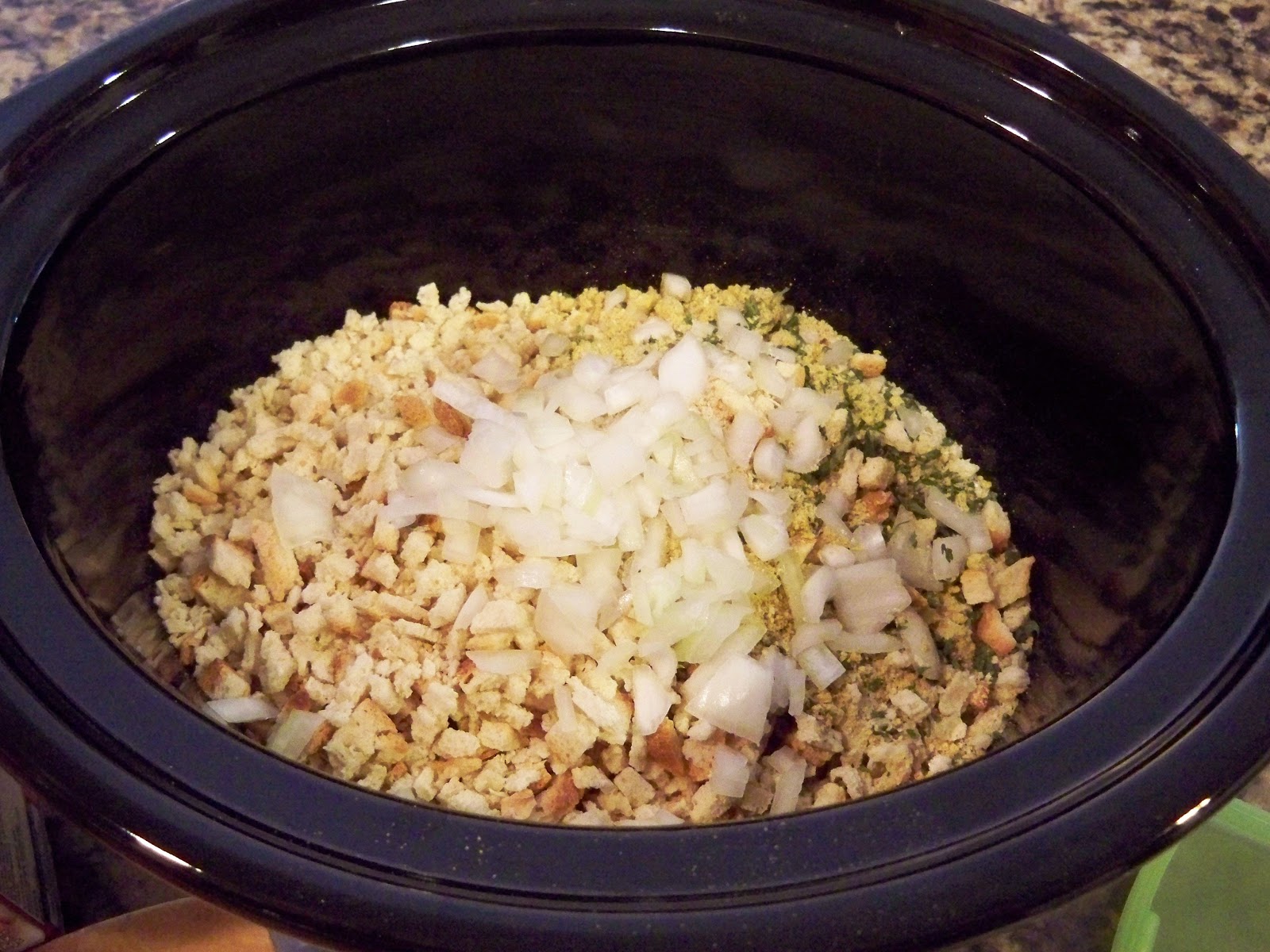 This is so easy and only requires a few things from your pantry. I use two boxes of Stove Top Stuffing Mix. Just open them up and dump them into your crock pot. Then chop up 1/2 to 3/4 of an onion (depending on size) and two stalks of celery.