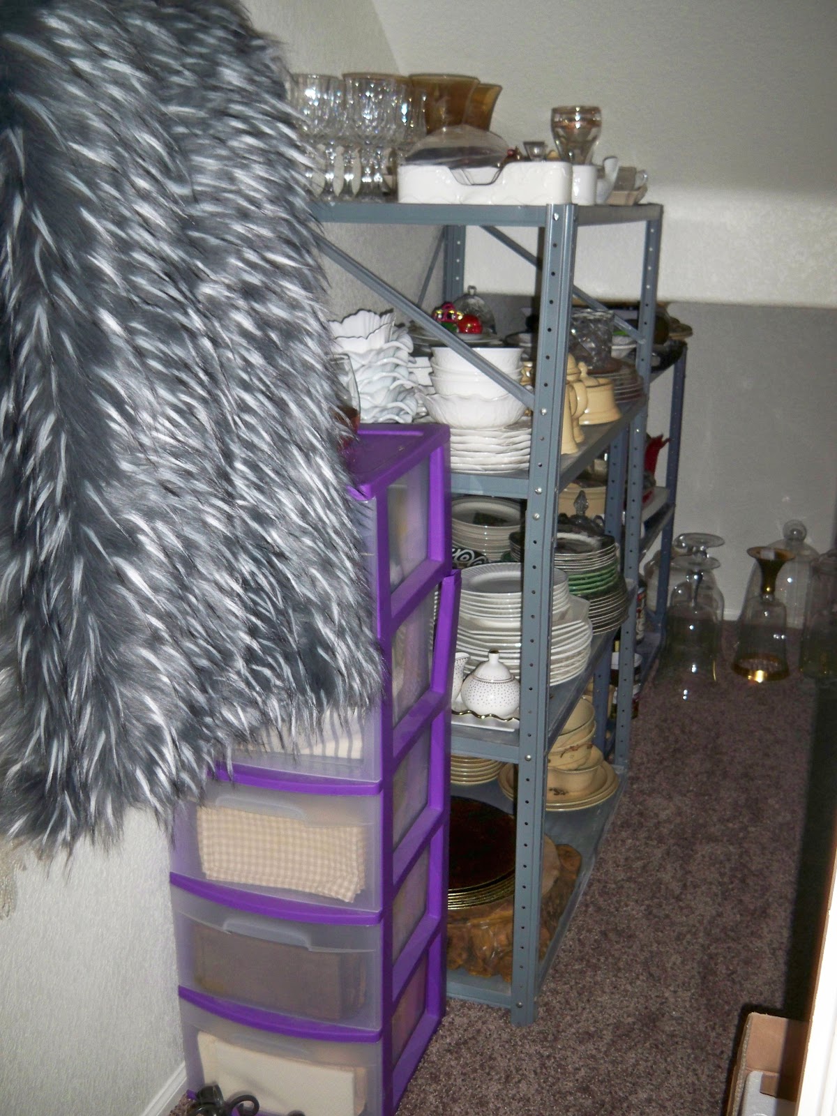 Not me, I took one look at this and said this is my new dish closet. Hubby had several of those metal shelves in the garage that he was working on, so I had him give me one big one and cut another one down to 3 ft. tall and now I have the most fabulous Dish Room.