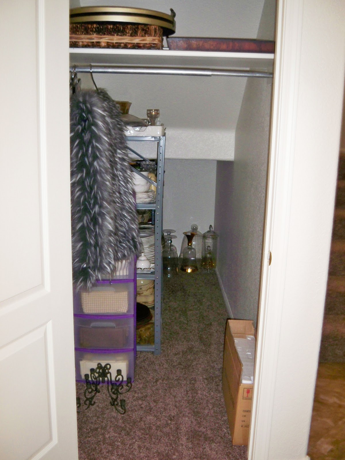 I can hang throws on the rod and put trays on the top shelf. On the right hand wall I plan to hang some towel bars and hang my table runners over them. I love this little space. It is definitely a wonderful treasure.