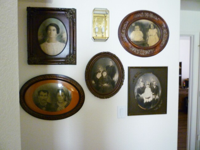 I think we all have pictures and accessories that mean something to us, but maybe not anyone else. I have a collection of old antique portraits of my ancestors. I love having these out, but where to hang them. I thought the landing would be a great spot. I found one curiosity about this house and where the builder chose to put light switches and wall pendants. As you can see, he put the light right in the center of this wall and then down lower and almost in the center he put the light switch. This does make it a little challenging when you want to hang pictures. Working around those elements isn’t always easy.