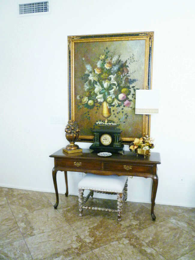 We are finally all cleared out and turned back into a liveable room so I am on a quest to decorate. I love this console table, it was a gift that is very precious to me and this large painting is one of my favorites also.