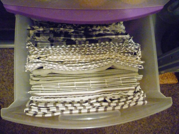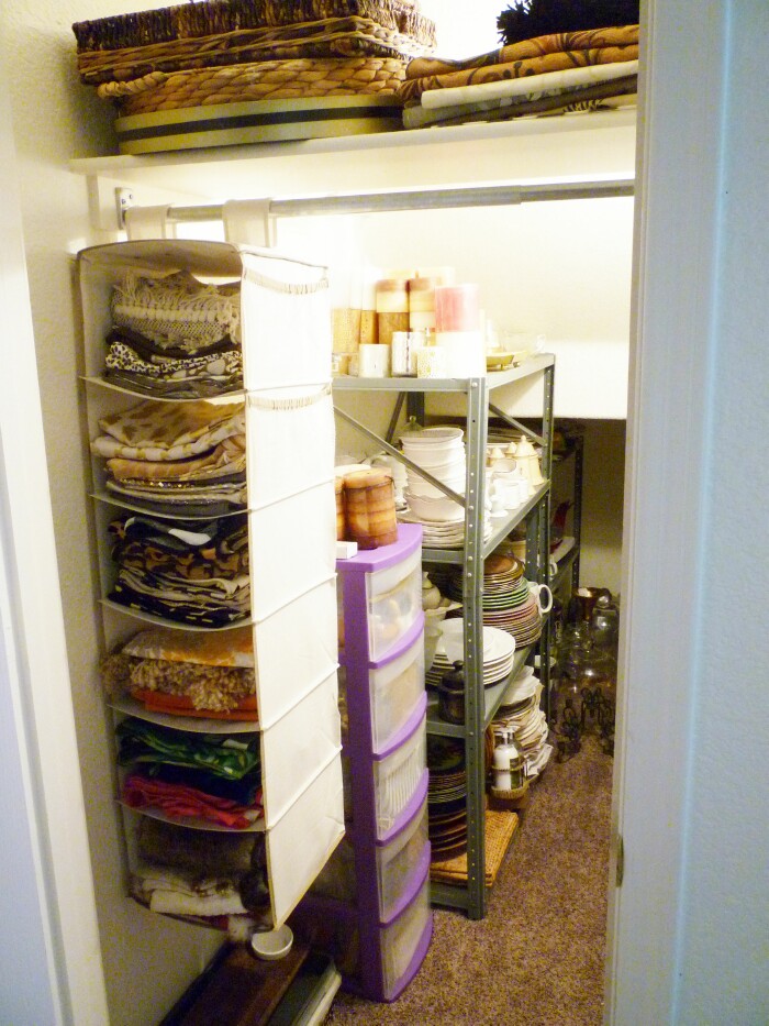 For the dish room I am using this purple plastic storage drawer unit . It was in my laundry room in the old house to hold all of my craft paints and things. Now it holds all my napkins and napkin rings and I can sort them by color and get to what I need really easily.